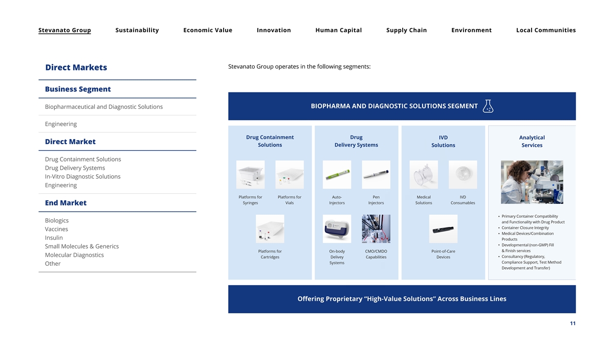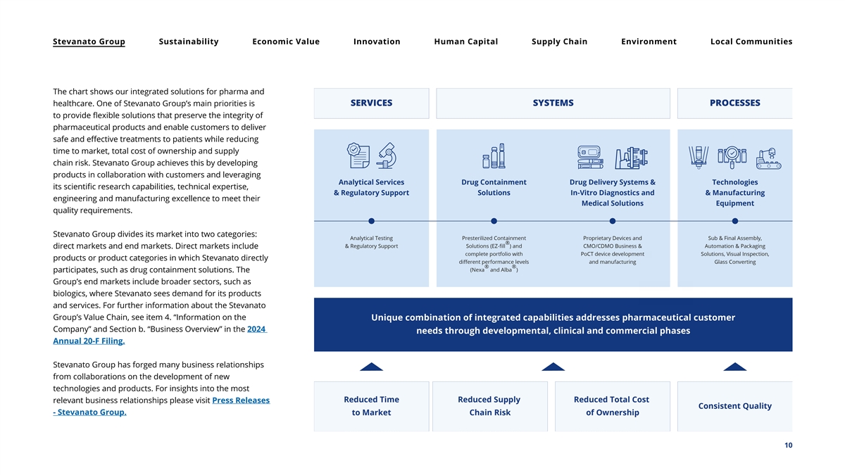 Stevanato Group Sustainability Economic Value Innovation Human Capital Supply Chain Environment Local Communities The chart shows our integrated solutions for pharma and healthcare. One of Stevanato Group’s main priorities is to provide flexible solutions that preserve the integrity of pharmaceutical products and enable customers to deliver safe and effective treatments to patients while reducing time to market, total cost of ownership and supply chain risk. Stevanato Group achieves this by developing products in collaboration with customers and leveraging its scientific research capabilities, technical expertise, engineering and manufacturing excellence to meet their quality requirements. Stevanato Group divides its market into two categories: direct markets and end markets. Direct markets include products or product categories in which Stevanato directly participates, such as drug containment solutions. The Group’s end markets include broader sectors, such as biologics, where Stevanato sees demand for its products and services. For further information about the Stevanato Group’s Value Chain, see item 4. “Information on the Company” and Section b. “Business Overview” in the 2024 Annual 20-F Filing. Stevanato Group has forged many business relationships from collaborations on the development of new technologies and products. For insights into the most relevant business relationships please visit Press Releases - Stevanato Group. 10