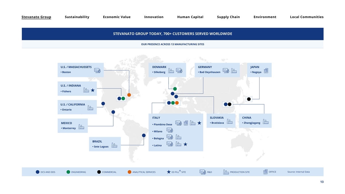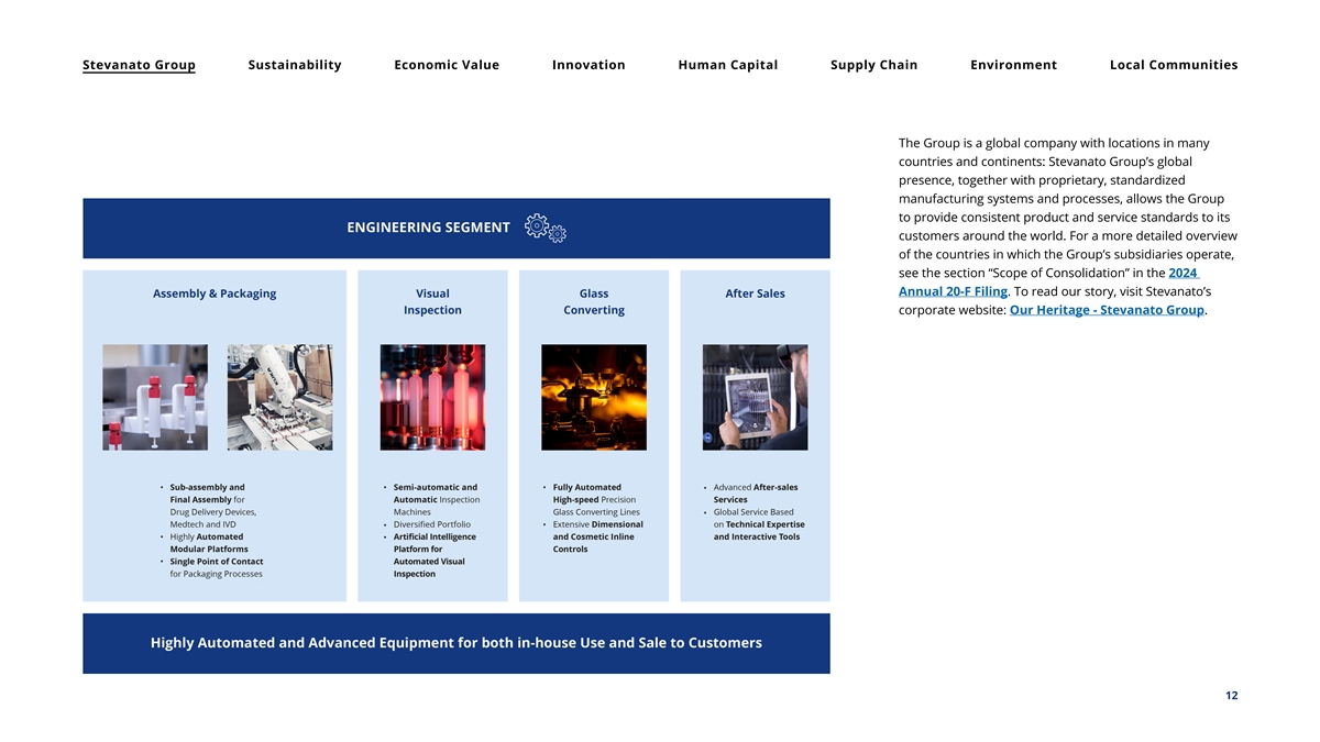 Stevanato Group Sustainability Economic Value Innovation Human Capital Supply Chain Environment Local Communities The Group is a global company with locations in many countries and continents: Stevanato Group’s global presence, together with proprietary, standardized manufacturing systems and processes, allows the Group to provide consistent product and service standards to its customers around the world. For a more detailed overview of the countries in which the Group’s subsidiaries operate, see the section “Scope of Consolidation” in the 2024 Annual 20-F Filing. To read our story, visit Stevanato’s corporate website: Our Heritage - Stevanato Group. 12