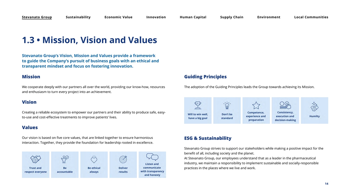 Stevanato Group Sustainability Economic Value Innovation Human Capital Supply Chain Environment Local Communities 1.3 • Mission, Vision and Values Stevanato Group’s Vision, Mission and Values provide a framework to guide the Company’s pursuit of business goals with an ethical and transparent mindset and focus on fostering innovation. Mission Guiding Principles We cooperate deeply with our partners all over the world, providing our know-how, resources The adoption of the Guiding Principles leads the Group towards achieving its Mission. and enthusiasm to turn every project into an achievement. Vision Creating a reliable ecosystem to empower our partners and their ability to produce safe, easy- to-use and cost-effective treatments to improve patients’ lives. Values Our vision is based on five core values, that are linked together to ensure harmonious ESG & Sustainability interaction. Together, they provide the foundation for leadership rooted in excellence. Stevanato Group strives to support our stakeholders while making a positive impact for the benefit of all, including society and the planet. At Stevanato Group, our employees understand that as a leader in the pharmaceutical industry, we maintain a responsibility to implement sustainable and socially-responsible practices in the places where we live and work. 14