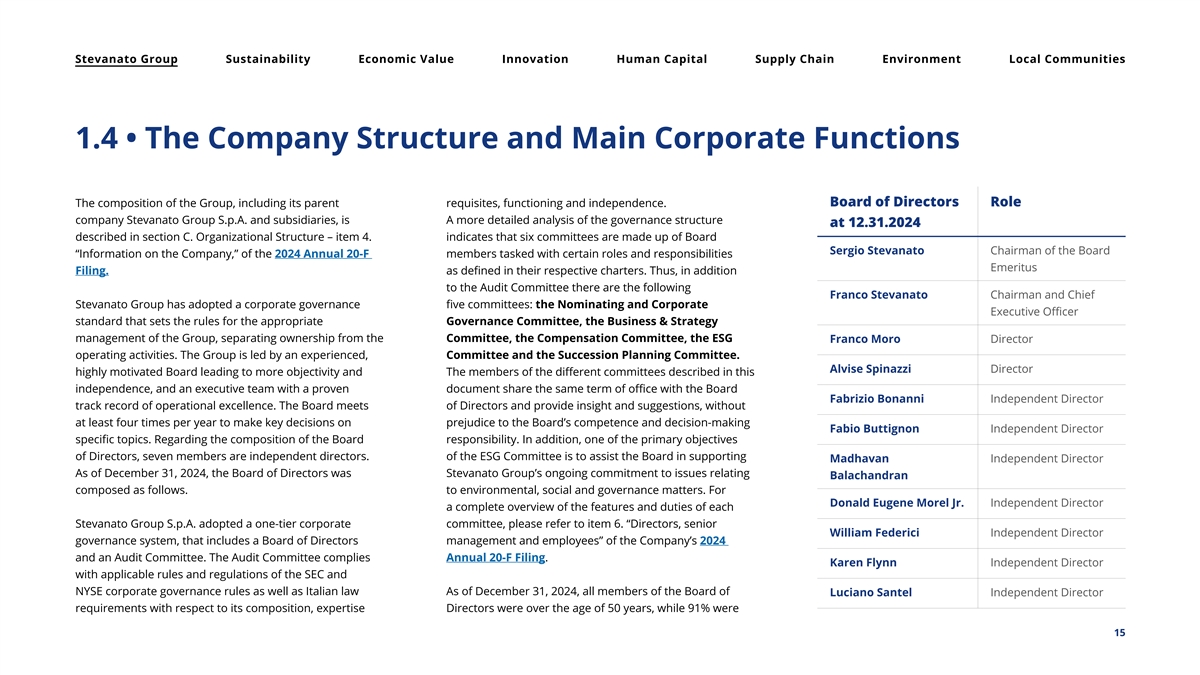 Stevanato Group Sustainability Economic Value Innovation Human Capital Supply Chain Environment Local Communities 1.4 • The Company Structure and Main Corporate Functions Board of Directors Role The composition of the Group, including its parent requisites, functioning and independence. company Stevanato Group S.p.A. and subsidiaries, is A more detailed analysis of the governance structure at 12.31.2024 described in section C. Organizational Structure – item 4. indicates that six committees are made up of Board Sergio Stevanato Chairman of the Board “Information on the Company,” of the 2024 Annual 20-F members tasked with certain roles and responsibilities Emeritus Filing. as defined in their respective charters. Thus, in addition to the Audit Committee there are the following Franco Stevanato Chairman and Chief Stevanato Group has adopted a corporate governance five committees: the Nominating and Corporate Executive Officer standard that sets the rules for the appropriate Governance Committee, the Business & Strategy management of the Group, separating ownership from the Committee, the Compensation Committee, the ESG Franco Moro Director operating activities. The Group is led by an experienced, Committee and the Succession Planning Committee. Alvise Spinazzi Director highly motivated Board leading to more objectivity and The members of the different committees described in this independence, and an executive team with a proven document share the same term of office with the Board Fabrizio Bonanni Independent Director track record of operational excellence. The Board meets of Directors and provide insight and suggestions, without at least four times per year to make key decisions on prejudice to the Board’s competence and decision-making Fabio Buttignon Independent Director specific topics. Regarding the composition of the Board responsibility. In addition, one of the primary objectives of Directors, seven members are independent directors. of the ESG Committee is to assist the Board in supporting Madhavan Independent Director As of December 31, 2024, the Board of Directors was Stevanato Group’s ongoing commitment to issues relating Balachandran composed as follows. to environmental, social and governance matters. For Donald Eugene Morel Jr. Independent Director a complete overview of the features and duties of each Stevanato Group S.p.A. adopted a one-tier corporate committee, please refer to item 6. “Directors, senior William Federici Independent Director governance system, that includes a Board of Directors management and employees” of the Company’s 2024 and an Audit Committee. The Audit Committee complies Annual 20-F Filing. Karen Flynn Independent Director with applicable rules and regulations of the SEC and NYSE corporate governance rules as well as Italian law As of December 31, 2024, all members of the Board of Luciano Santel Independent Director requirements with respect to its composition, expertise Directors were over the age of 50 years, while 91% were 15