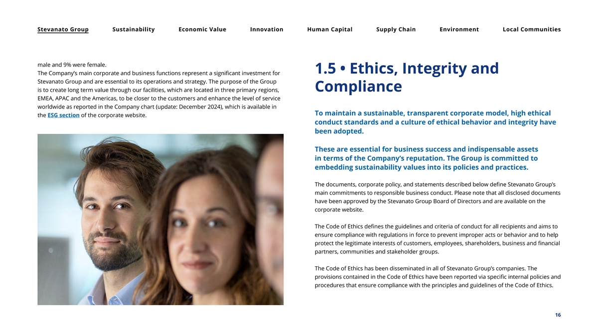 Stevanato Group Sustainability Economic Value Innovation Human Capital Supply Chain Environment Local Communities male and 9% were female. 1.5 • Ethics, Integrity and The Company’s main corporate and business functions represent a significant investment for Stevanato Group and are essential to its operations and strategy. The purpose of the Group Compliance is to create long term value through our facilities, which are located in three primary regions, EMEA, APAC and the Americas, to be closer to the customers and enhance the level of service worldwide as reported in the Company chart (update: December 2024), which is available in To maintain a sustainable, transparent corporate model, high ethical the ESG section of the corporate website. conduct standards and a culture of ethical behavior and integrity have been adopted. These are essential for business success and indispensable assets in terms of the Company’s reputation. The Group is committed to embedding sustainability values into its policies and practices. The documents, corporate policy, and statements described below define Stevanato Group’s main commitments to responsible business conduct. Please note that all disclosed documents have been approved by the Stevanato Group Board of Directors and are available on the corporate website. The Code of Ethics defines the guidelines and criteria of conduct for all recipients and aims to ensure compliance with regulations in force to prevent improper acts or behavior and to help protect the legitimate interests of customers, employees, shareholders, business and financial partners, communities and stakeholder groups. The Code of Ethics has been disseminated in all of Stevanato Group’s companies. The provisions contained in the Code of Ethics have been reported via specific internal policies and procedures that ensure compliance with the principles and guidelines of the Code of Ethics. 16