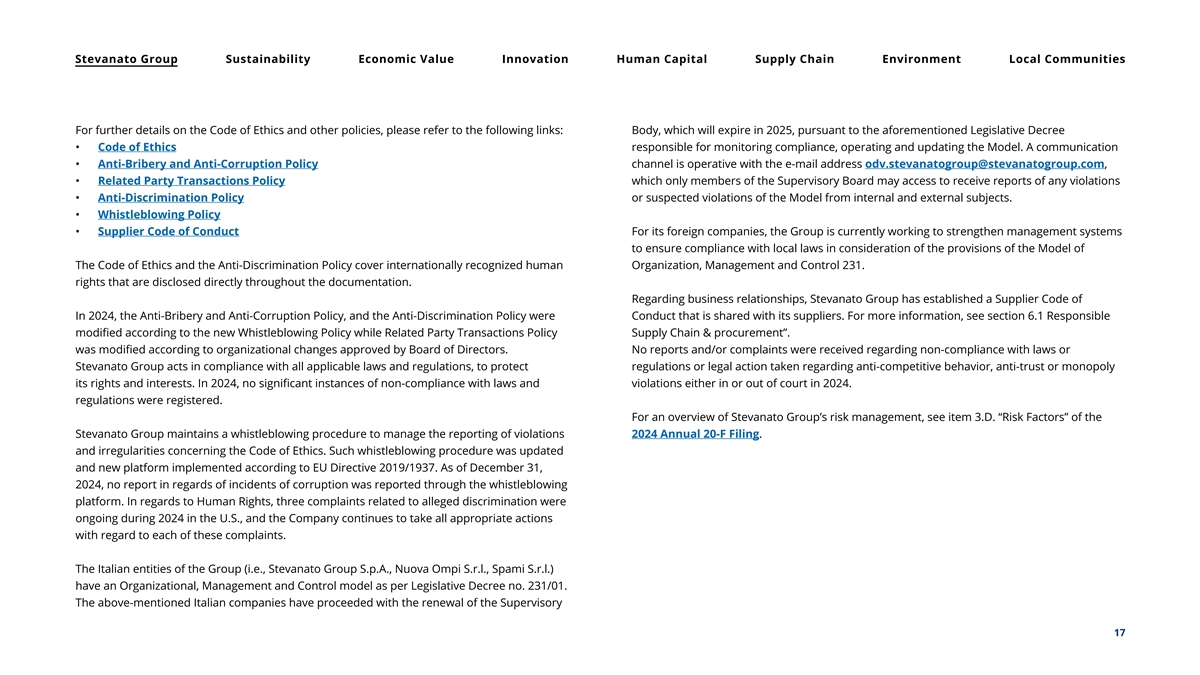 Stevanato Group Sustainability Economic Value Innovation Human Capital Supply Chain Environment Local Communities For further details on the Code of Ethics and other policies, please refer to the following links: Body, which will expire in 2025, pursuant to the aforementioned Legislative Decree • Code of Ethics responsible for monitoring compliance, operating and updating the Model. A communication • Anti-Bribery and Anti-Corruption Policy channel is operative with the e-mail address odv.stevanatogroup@stevanatogroup.com, • Related Party Transactions Policy which only members of the Supervisory Board may access to receive reports of any violations • Anti-Discrimination Policy or suspected violations of the Model from internal and external subjects. • Whistleblowing Policy • Supplier Code of Conduct For its foreign companies, the Group is currently working to strengthen management systems to ensure compliance with local laws in consideration of the provisions of the Model of The Code of Ethics and the Anti-Discrimination Policy cover internationally recognized human Organization, Management and Control 231. rights that are disclosed directly throughout the documentation. Regarding business relationships, Stevanato Group has established a Supplier Code of In 2024, the Anti-Bribery and Anti-Corruption Policy, and the Anti-Discrimination Policy were Conduct that is shared with its suppliers. For more information, see section 6.1 Responsible modified according to the new Whistleblowing Policy while Related Party Transactions Policy Supply Chain & procurement”. was modified according to organizational changes approved by Board of Directors. No reports and/or complaints were received regarding non-compliance with laws or Stevanato Group acts in compliance with all applicable laws and regulations, to protect regulations or legal action taken regarding anti-competitive behavior, anti-trust or monopoly its rights and interests. In 2024, no significant instances of non-compliance with laws and violations either in or out of court in 2024. regulations were registered. For an overview of Stevanato Group’s risk management, see item 3.D. “Risk Factors” of the Stevanato Group maintains a whistleblowing procedure to manage the reporting of violations 2024 Annual 20-F Filing. and irregularities concerning the Code of Ethics. Such whistleblowing procedure was updated and new platform implemented according to EU Directive 2019/1937. As of December 31, 2024, no report in regards of incidents of corruption was reported through the whistleblowing platform. In regards to Human Rights, three complaints related to alleged discrimination were ongoing during 2024 in the U.S., and the Company continues to take all appropriate actions with regard to each of these complaints. The Italian entities of the Group (i.e., Stevanato Group S.p.A., Nuova Ompi S.r.l., Spami S.r.l.) have an Organizational, Management and Control model as per Legislative Decree no. 231/01. The above-mentioned Italian companies have proceeded with the renewal of the Supervisory 17