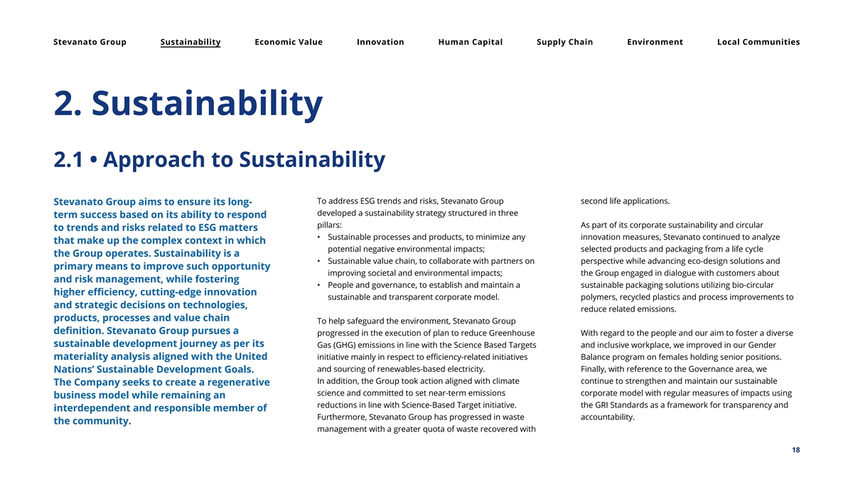 Stevanato Group Sustainability Economic Value Innovation Human Capital Supply Chain Environment Local Communities 2. Sustainability 2.1 • Approach to Sustainability To address ESG trends and risks, Stevanato Group second life applications. Stevanato Group aims to ensure its long- developed a sustainability strategy structured in three term success based on its ability to respond pillars: As part of its corporate sustainability and circular to trends and risks related to ESG matters • Sustainable processes and products, to minimize any innovation measures, Stevanato continued to analyze that make up the complex context in which potential negative environmental impacts; selected products and packaging from a life cycle the Group operates. Sustainability is a • Sustainable value chain, to collaborate with partners on perspective while advancing eco-design solutions and primary means to improve such opportunity improving societal and environmental impacts; the Group engaged in dialogue with customers about and risk management, while fostering • People and governance, to establish and maintain a sustainable packaging solutions utilizing bio-circular higher efficiency, cutting-edge innovation sustainable and transparent corporate model. polymers, recycled plastics and process improvements to and strategic decisions on technologies, reduce related emissions. products, processes and value chain To help safeguard the environment, Stevanato Group definition. Stevanato Group pursues a progressed in the execution of plan to reduce Greenhouse With regard to the people and our aim to foster a diverse sustainable development journey as per its Gas (GHG) emissions in line with the Science Based Targets and inclusive workplace, we improved in our Gender materiality analysis aligned with the United initiative mainly in respect to efficiency-related initiatives Balance program on females holding senior positions. and sourcing of renewables-based electricity. Finally, with reference to the Governance area, we Nations’ Sustainable Development Goals. In addition, the Group took action aligned with climate continue to strengthen and maintain our sustainable The Company seeks to create a regenerative science and committed to set near-term emissions corporate model with regular measures of impacts using business model while remaining an reductions in line with Science-Based Target initiative. the GRI Standards as a framework for transparency and interdependent and responsible member of Furthermore, Stevanato Group has progressed in waste accountability. the community. management with a greater quota of waste recovered with 18
