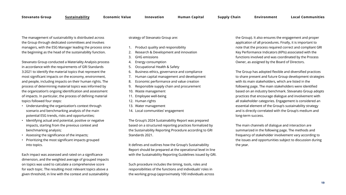 Stevanato Group Sustainability Economic Value Innovation Human Capital Supply Chain Environment Local Communities The management of sustainability is distributed across strategy of Stevanato Group are: the Group). It also ensures the engagement and proper the Group through dedicated committees and involves application of all procedures. Finally, it is important to managers, with the ESG Manager leading the process since 1. Product quality and responsibility note that the process required correct and compliant GRI the beginning as the head of the sustainability function. 2. Research & Development and innovation Key Performance Indicators (KPIs) associated with the 3. GHG emissions functions involved and was coordinated by the Process Stevanato Group conducted a Materiality Analysis process 4. Energy consumption Owner, as assigned by the Board of Directors. in accordance with the requirements of GRI Standards 5. Occupational Health & Safety 3:2021 to identify the material topics that represent the 6. Business ethics, governance and compliance The Group has adopted flexible and diversified practices most significant impacts on the economy, environment, 7. Human capital management and development to share present and future Group development strategies and people, including impacts on their human rights. The 8. Economic performance and value creation with its main stakeholders, which are listed in the process of determining material topics was informed by 9. Responsible supply chain and procurement following page. The main stakeholders were identified the organization’s ongoing identification and assessment 10. Waste management based on an industry benchmark. Stevanato Group adopts of impacts. In particular, the process of defining material 11. Employee well-being practices that encourage dialogue and involvement with topics followed four steps: 12. Human rights all stakeholder categories. Engagement is considered an • Understanding the organization’s context through 13. Water management essential element of the Group’s sustainability strategy scenario and benchmarking analysis of the main 14. Local communities’ engagement and is directly correlated with the Group’s medium and potential ESG trends, risks and opportunities; long-term success. • Identifying actual and potential, positive or negative The Group’s 2024 Sustainability Report was prepared impacts, starting from the previous context and based on a structured reporting practices formalized by The main channels of dialogue and interaction are benchmarking analysis; the Sustainability Reporting Procedure according to GRI summarized in the following page. The methods and • Assessing the significance of the impacts; Standards 2021. frequency of stakeholder involvement vary according to • Prioritizing the most significant impacts grouped the issues and opportunities subject to discussion during into topics. It defines and outlines how the Group’s Sustainability the year. Report should be prepared at the operational level in line Each impact was assessed and rated on a significance with the Sustainability Reporting Guidelines issued by GRI. dimension, and the weighted average of grouped impacts on topics was used to calculate a comprehensive score Such procedure includes the timing, tools, roles and for each topic. The resulting most relevant topics above a responsibilities of the functions and individuals’ roles in given threshold, in line with the context and sustainability the working group (approximately 100 individuals across 19