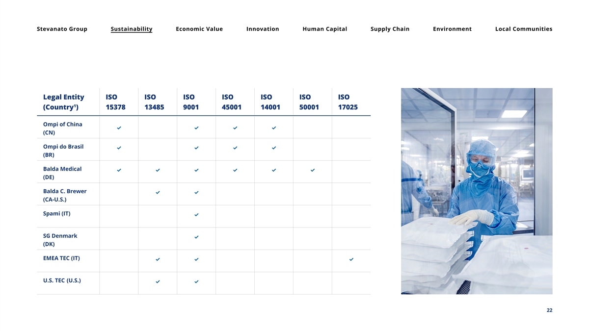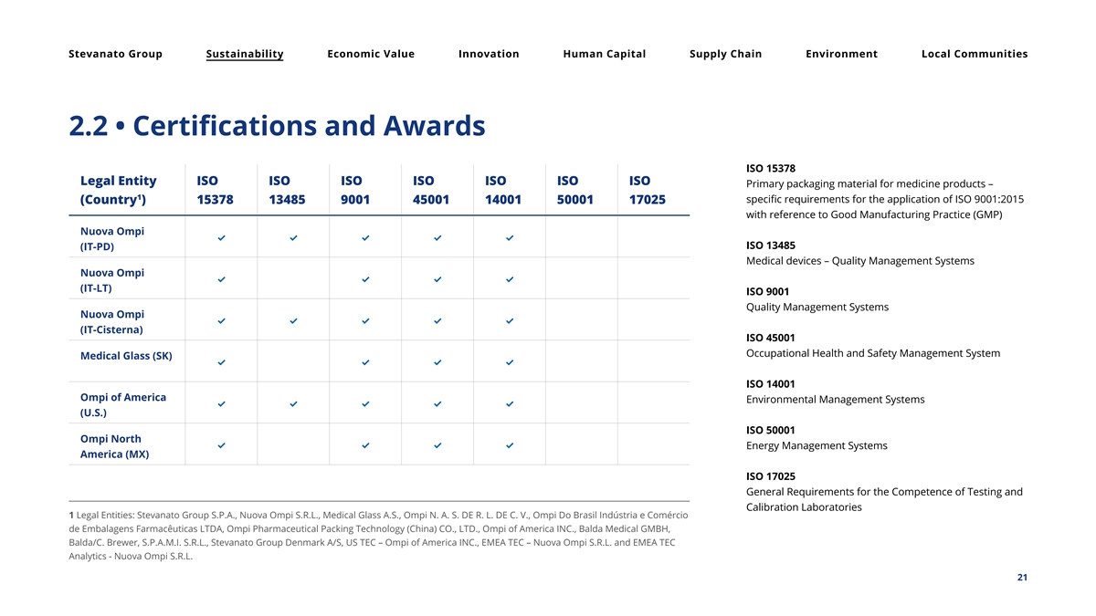 Stevanato Group Sustainability Economic Value Innovation Human Capital Supply Chain Environment Local Communities 2.2 • Certifications and Awards ISO 15378 Legal Entity ISO ISO ISO ISO ISO ISO ISO Primary packaging material for medicine products – 1 specific requirements for the application of ISO 9001:2015 (Country ) 15378 13485 9001 45001 14001 50001 17025 with reference to Good Manufacturing Practice (GMP) Nuova Ompi ✓✓✓✓✓ ISO 13485 (IT-PD) Medical devices – Quality Management Systems Nuova Ompi ✓✓✓✓ (IT-LT) ISO 9001 Quality Management Systems Nuova Ompi ✓✓✓✓✓ (IT-Cisterna) ISO 45001 Occupational Health and Safety Management System Medical Glass (SK) ✓✓✓✓ ISO 14001 Ompi of America Environmental Management Systems ✓✓✓✓✓ (U.S.) ISO 50001 Ompi North ✓✓✓✓ Energy Management Systems America (MX) ISO 17025 General Requirements for the Competence of Testing and Calibration Laboratories 1 Legal Entities: Stevanato Group S.P.A., Nuova Ompi S.R.L., Medical Glass A.S., Ompi N. A. S. DE R. L. DE C. V., Ompi Do Brasil Indústria e Comércio de Embalagens Farmacêuticas LTDA, Ompi Pharmaceutical Packing Technology (China) CO., LTD., Ompi of America INC., Balda Medical GMBH, Balda/C. Brewer, S.P.A.M.I. S.R.L., Stevanato Group Denmark A/S, US TEC – Ompi of America INC., EMEA TEC – Nuova Ompi S.R.L. and EMEA TEC Analytics - Nuova Ompi S.R.L. 21