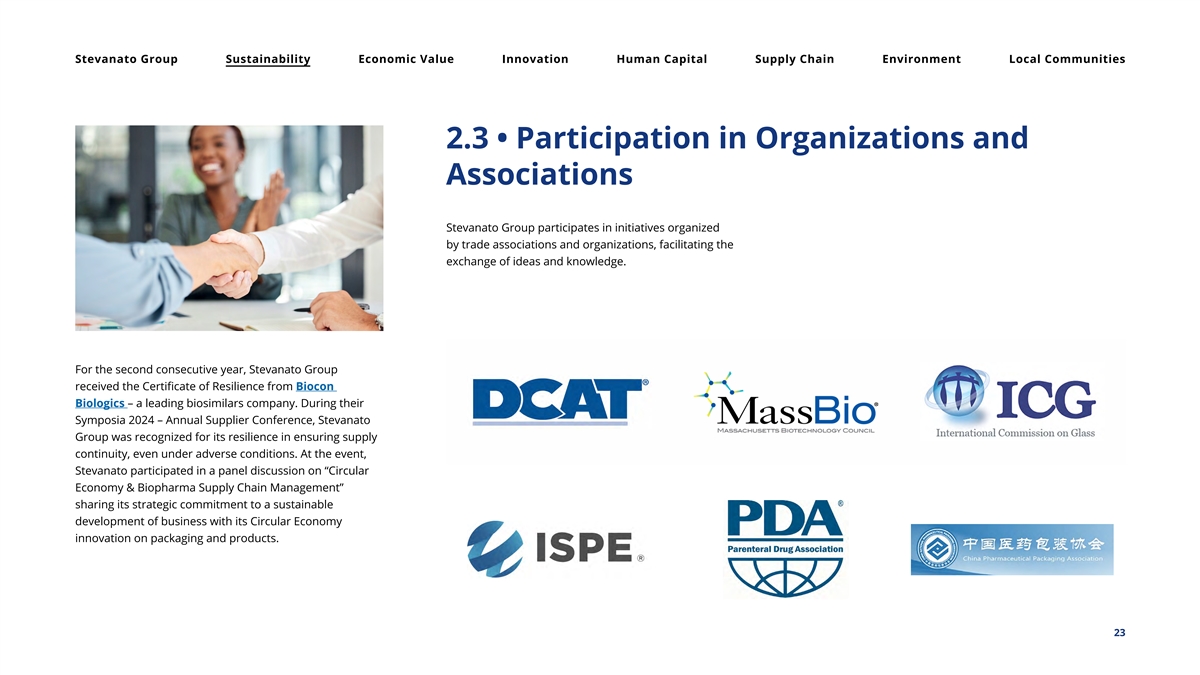 Stevanato Group Sustainability Economic Value Innovation Human Capital Supply Chain Environment Local Communities 2.3 • Participation in Organizations and Associations Stevanato Group participates in initiatives organized by trade associations and organizations, facilitating the exchange of ideas and knowledge. For the second consecutive year, Stevanato Group received the Certificate of Resilience from Biocon Biologics – a leading biosimilars company. During their Symposia 2024 – Annual Supplier Conference, Stevanato Group was recognized for its resilience in ensuring supply continuity, even under adverse conditions. At the event, Stevanato participated in a panel discussion on “Circular Economy & Biopharma Supply Chain Management” sharing its strategic commitment to a sustainable development of business with its Circular Economy innovation on packaging and products. 23