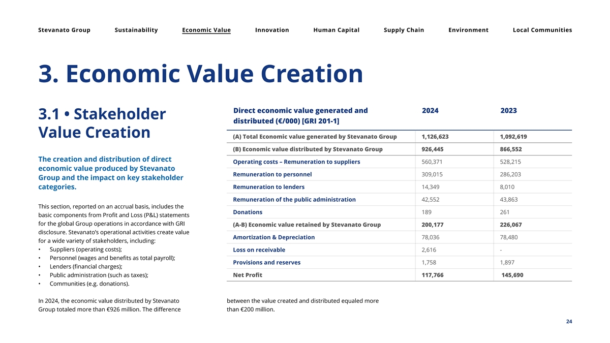 Stevanato Group Sustainability Economic Value Innovation Human Capital Supply Chain Environment Local Communities 3. Economic V alue Creation Direct economic value generated and 2024 2023 3.1 • Stakeholder distributed (€/000) [GRI 201-1] Value Creation (A) Total Economic value generated by Stevanato Group 1,126,623 1,092,619 (B) Economic value distributed by Stevanato Group 926,445 866,552 The creation and distribution of direct Operating costs – Remuneration to suppliers 560,371 528,215 economic value produced by Stevanato Remuneration to personnel 309,015 286,203 Group and the impact on key stakeholder Remuneration to lenders 14,349 8,010 categories. Remuneration of the public administration 42,552 43,863 This section, reported on an accrual basis, includes the Donations 189 261 basic components from Profit and Loss (P&L) statements for the global Group operations in accordance with GRI (A-B) Economic value retained by Stevanato Group 200,177 226,067 disclosure. Stevanato’s operational activities create value Amortization & Depreciation 78,036 78,480 for a wide variety of stakeholders, including: • Suppliers (operating costs); Loss on receivable 2,616 - • Personnel (wages and benefits as total payroll); Provisions and reserves 1,758 1,897 • Lenders (financial charges); • Public administration (such as taxes); Net Profit 117,766 145,690 • Communities (e.g. donations). In 2024, the economic value distributed by Stevanato between the value created and distributed equaled more Group totaled more than €926 million. The difference than €200 million. 24