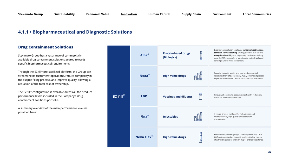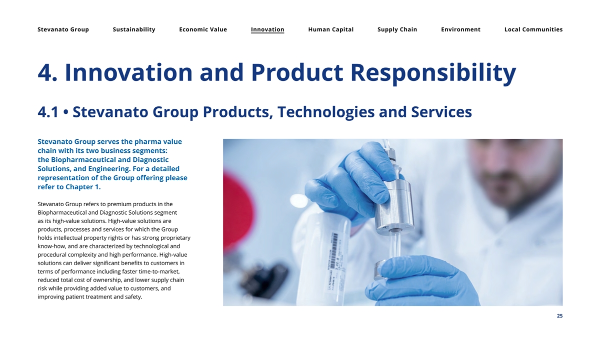 Stevanato Group Sustainability Economic Value Innovation Human Capital Supply Chain Environment Local Communities 4. Inno vation and Product Responsibility 4.1 • Stevanato Group Products, Technologies and Services Stevanato Group serves the pharma value chain with its two business segments: the Biopharmaceutical and Diagnostic Solutions, and Engineering. For a detailed representation of the Group offering please refer to Chapter 1. Stevanato Group refers to premium products in the Biopharmaceutical and Diagnostic Solutions segment as its high-value solutions. High-value solutions are products, processes and services for which the Group holds intellectual property rights or has strong proprietary know-how, and are characterized by technological and procedural complexity and high performance. High-value solutions can deliver significant benefits to customers in terms of performance including faster time-to-market, reduced total cost of ownership, and lower supply chain risk while providing added value to customers, and improving patient treatment and safety. 25