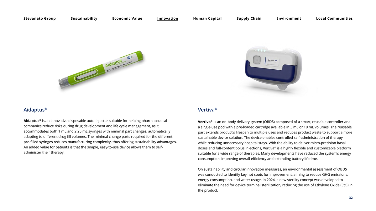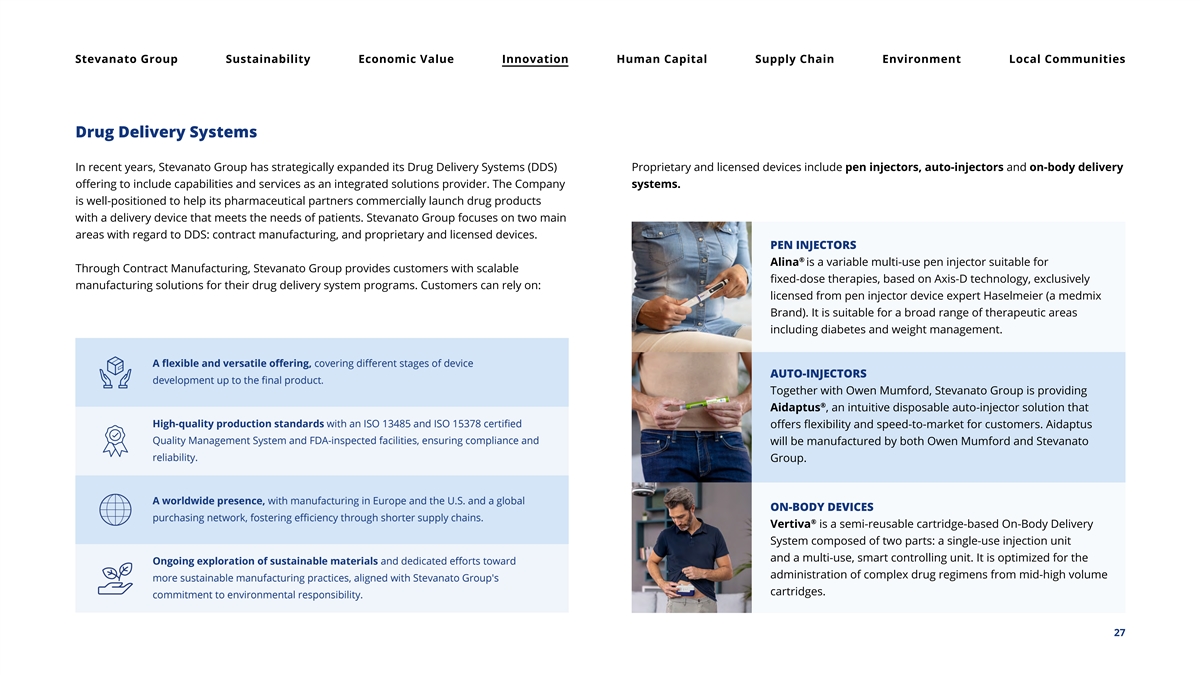 Stevanato Group Sustainability Economic Value Innovation Human Capital Supply Chain Environment Local Communities Drug Delivery Systems In recent years, Stevanato Group has strategically expanded its Drug Delivery Systems (DDS) Proprietary and licensed devices include pen injectors, auto-injectors and on-body delivery offering to include capabilities and services as an integrated solutions provider. The Company systems. is well-positioned to help its pharmaceutical partners commercially launch drug products with a delivery device that meets the needs of patients. Stevanato Group focuses on two main areas with regard to DDS: contract manufacturing, and proprietary and licensed devices. PEN INJECTORS ® Alina is a variable multi-use pen injector suitable for Through Contract Manufacturing, Stevanato Group provides customers with scalable fixed-dose therapies, based on Axis-D technology, exclusively manufacturing solutions for their drug delivery system programs. Customers can rely on: licensed from pen injector device expert Haselmeier (a medmix Brand). It is suitable for a broad range of therapeutic areas including diabetes and weight management. A flexible and versatile offering, covering different stages of device AUTO-INJECTORS development up to the final product. Together with Owen Mumford, Stevanato Group is providing ® Aidaptus , an intuitive disposable auto-injector solution that High-quality production standards with an ISO 13485 and ISO 15378 certified offers flexibility and speed-to-market for customers. Aidaptus Quality Management System and FDA-inspected facilities, ensuring compliance and will be manufactured by both Owen Mumford and Stevanato reliability. Group. A worldwide presence, with manufacturing in Europe and the U.S. and a global ON-BODY DEVICES purchasing network, fostering efficiency through shorter supply chains. ® Vertiva is a semi-reusable cartridge-based On-Body Delivery System composed of two parts: a single-use injection unit and a multi-use, smart controlling unit. It is optimized for the Ongoing exploration of sustainable materials and dedicated efforts toward administration of complex drug regimens from mid-high volume more sustainable manufacturing practices, aligned with Stevanato Group's cartridges. commitment to environmental responsibility. 27