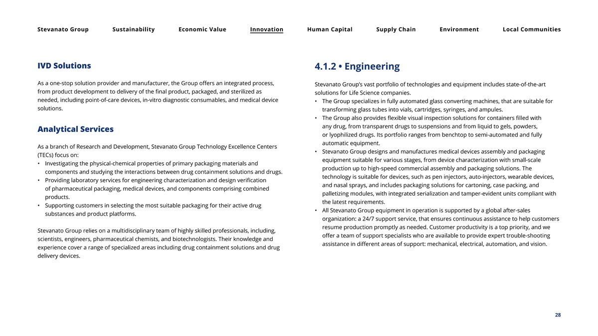 Stevanato Group Sustainability Economic Value Innovation Human Capital Supply Chain Environment Local Communities IVD Solutions 4.1.2 • Engineering As a one-stop solution provider and manufacturer, the Group offers an integrated process, Stevanato Group’s vast portfolio of technologies and equipment includes state-of-the-art from product development to delivery of the final product, packaged, and sterilized as solutions for Life Science companies. needed, including point-of-care devices, in-vitro diagnostic consumables, and medical device • The Group specializes in fully automated glass converting machines, that are suitable for solutions. transforming glass tubes into vials, cartridges, syringes, and ampules. • The Group also provides flexible visual inspection solutions for containers filled with any drug, from transparent drugs to suspensions and from liquid to gels, powders, Analytical Services or lyophilized drugs. Its portfolio ranges from benchtop to semi-automated and fully automatic equipment. As a branch of Research and Development, Stevanato Group Technology Excellence Centers • Stevanato Group designs and manufactures medical devices assembly and packaging (TECs) focus on: equipment suitable for various stages, from device characterization with small-scale • Investigating the physical-chemical properties of primary packaging materials and production up to high-speed commercial assembly and packaging solutions. The components and studying the interactions between drug containment solutions and drugs. technology is suitable for devices, such as pen injectors, auto-injectors, wearable devices, • Providing laboratory services for engineering characterization and design verification and nasal sprays, and includes packaging solutions for cartoning, case packing, and of pharmaceutical packaging, medical devices, and components comprising combined palletizing modules, with integrated serialization and tamper-evident units compliant with products. the latest requirements. • Supporting customers in selecting the most suitable packaging for their active drug • All Stevanato Group equipment in operation is supported by a global after-sales substances and product platforms. organization: a 24/7 support service, that ensures continuous assistance to help customers resume production promptly as needed. Customer productivity is a top priority, and we Stevanato Group relies on a multidisciplinary team of highly skilled professionals, including, offer a team of support specialists who are available to provide expert trouble-shooting scientists, engineers, pharmaceutical chemists, and biotechnologists. Their knowledge and assistance in different areas of support: mechanical, electrical, automation, and vision. experience cover a range of specialized areas including drug containment solutions and drug delivery devices. 28