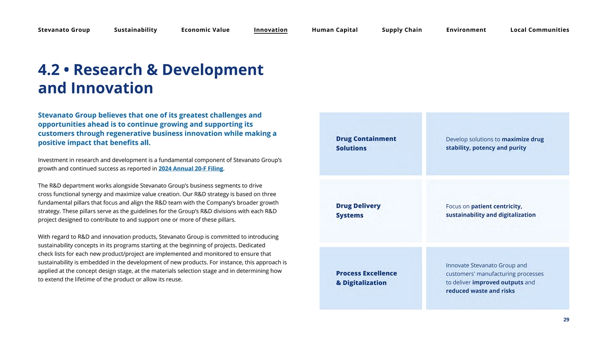 Stevanato Group Sustainability Economic Value Innovation Human Capital Supply Chain Environment Local Communities 4.2 • Research & Development and Innovation Stevanato Group believes that one of its greatest challenges and opportunities ahead is to continue growing and supporting its customers through regenerative business innovation while making a positive impact that benefits all. Investment in research and development is a fundamental component of Stevanato Group’s growth and continued success as reported in 2024 Annual 20-F Filing. The R&D department works alongside Stevanato Group’s business segments to drive cross functional synergy and maximize value creation. Our R&D strategy is based on three fundamental pillars that focus and align the R&D team with the Company’s broader growth strategy. These pillars serve as the guidelines for the Group’s R&D divisions with each R&D project designed to contribute to and support one or more of these pillars. With regard to R&D and innovation products, Stevanato Group is committed to introducing sustainability concepts in its programs starting at the beginning of projects. Dedicated check lists for each new product/project are implemented and monitored to ensure that sustainability is embedded in the development of new products. For instance, this approach is applied at the concept design stage, at the materials selection stage and in determining how to extend the lifetime of the product or allow its reuse. 29