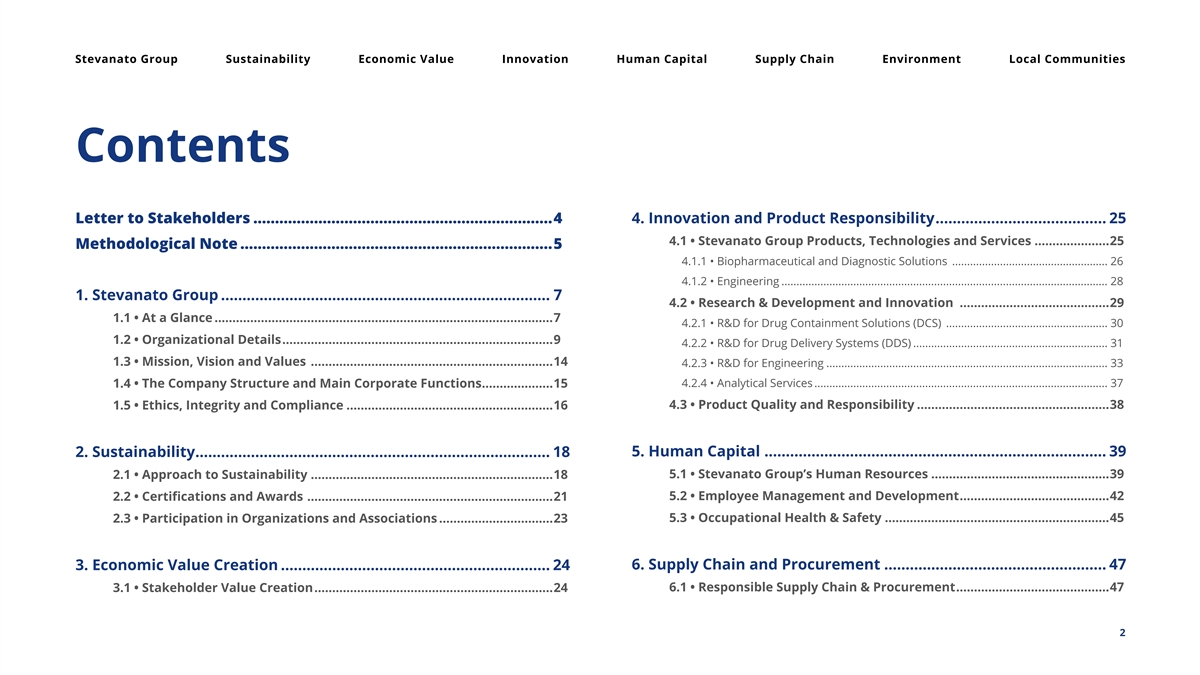Stevanato Group Sustainability Economic Value Innovation Human Capital Supply Chain Environment Local Communities Contents Letter to Stakeholders .....................................................................4 4. Innovation and Product Responsibility ........................................ 25 4.1 • Stevanato Group Products, Technologies and Services .....................25 Methodological Note ........................................................................5 4.1.1 • Biopharmaceutical and Diagnostic Solutions .................................................... 26 4.1.2 • Engineering ............................................................................................................. 28 1. Stevanato Group ............................................................................. 7 4.2 • Research & Development and Innovation ..........................................29 1.1 • At a Glance ...............................................................................................7 4.2.1 • R&D for Drug Containment Solutions (DCS) ...................................................... 30 1.2 • Organizational Details ............................................................................9 4.2.2 • R&D for Drug Delivery Systems (DDS) ................................................................. 31 1.3 • Mission, Vision and Values ....................................................................14 4.2.3 • R&D for Engineering .............................................................................................. 33 4.2.4 • Analytical Services .................................................................................................. 37 1.4 • The Company Structure and Main Corporate Functions ....................15 4.3 • Product Quality and Responsibility ......................................................38 1.5 • Ethics, Integrity and Compliance ..........................................................16 5. Human Capital ................................................................................ 39 2. Sustainability ................................................................................... 18 5.1 • Stevanato Group’s Human Resources ..................................................39 2.1 • Approach to Sustainability ....................................................................18 5.2 • Employee Management and Development ..........................................42 2.2 • Certifications and Awards .....................................................................21 5.3 • Occupational Health & Safety ...............................................................45 2.3 • Participation in Organizations and Associations ................................23 6. Supply Chain and Procurement .................................................... 47 3. Economic Value Creation ............................................................... 24 6.1 • Responsible Supply Chain & Procurement ...........................................47 3.1 • Stakeholder Value Creation ...................................................................24 2