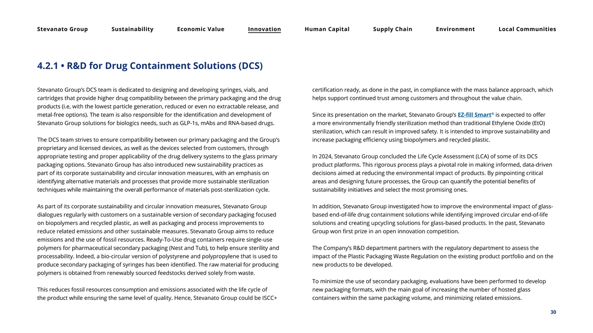 Stevanato Group Sustainability Economic Value Innovation Human Capital Supply Chain Environment Local Communities 4.2.1 • R&D for Drug Containment Solutions (DCS) Stevanato Group’s DCS team is dedicated to designing and developing syringes, vials, and certification ready, as done in the past, in compliance with the mass balance approach, which cartridges that provide higher drug compatibility between the primary packaging and the drug helps support continued trust among customers and throughout the value chain. products (i.e, with the lowest particle generation, reduced or even no extractable release, and ® metal-free options). The team is also responsible for the identification and development of Since its presentation on the market, Stevanato Group’s EZ-fill Smart is expected to offer Stevanato Group solutions for biologics needs, such as GLP-1s, mAbs and RNA-based drugs. a more environmentally friendly sterilization method than traditional Ethylene Oxide (EtO) sterilization, which can result in improved safety. It is intended to improve sustainability and The DCS team strives to ensure compatibility between our primary packaging and the Group’s increase packaging efficiency using biopolymers and recycled plastic. proprietary and licensed devices, as well as the devices selected from customers, through appropriate testing and proper applicability of the drug delivery systems to the glass primary In 2024, Stevanato Group concluded the Life Cycle Assessment (LCA) of some of its DCS packaging options. Stevanato Group has also introduced new sustainability practices as product platforms. This rigorous process plays a pivotal role in making informed, data-driven part of its corporate sustainability and circular innovation measures, with an emphasis on decisions aimed at reducing the environmental impact of products. By pinpointing critical identifying alternative materials and processes that provide more sustainable sterilization areas and designing future processes, the Group can quantify the potential benefits of techniques while maintaining the overall performance of materials post-sterilization cycle. sustainability initiatives and select the most promising ones. As part of its corporate sustainability and circular innovation measures, Stevanato Group In addition, Stevanato Group investigated how to improve the environmental impact of glass- dialogues regularly with customers on a sustainable version of secondary packaging focused based end-of-life drug containment solutions while identifying improved circular end-of-life on biopolymers and recycled plastic, as well as packaging and process improvements to solutions and creating upcycling solutions for glass-based products. In the past, Stevanato reduce related emissions and other sustainable measures. Stevanato Group aims to reduce Group won first prize in an open innovation competition. emissions and the use of fossil resources. Ready-To-Use drug containers require single-use polymers for pharmaceutical secondary packaging (Nest and Tub), to help ensure sterility and The Company’s R&D department partners with the regulatory department to assess the processability. Indeed, a bio-circular version of polystyrene and polypropylene that is used to impact of the Plastic Packaging Waste Regulation on the existing product portfolio and on the produce secondary packaging of syringes has been identified. The raw material for producing new products to be developed. polymers is obtained from renewably sourced feedstocks derived solely from waste. To minimize the use of secondary packaging, evaluations have been performed to develop This reduces fossil resources consumption and emissions associated with the life cycle of new packaging formats, with the main goal of increasing the number of hosted glass the product while ensuring the same level of quality. Hence, Stevanato Group could be ISCC+ containers within the same packaging volume, and minimizing related emissions. 30