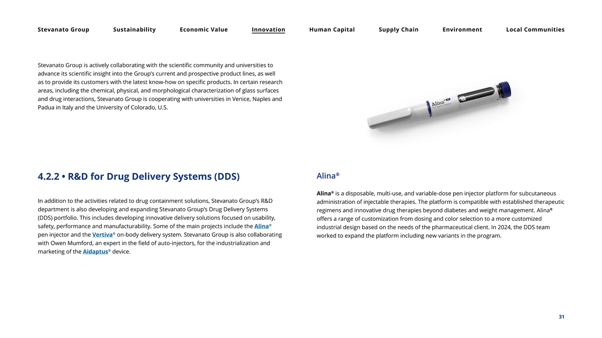 Stevanato Group Sustainability Economic Value Innovation Human Capital Supply Chain Environment Local Communities Stevanato Group is actively collaborating with the scientific community and universities to advance its scientific insight into the Group’s current and prospective product lines, as well as to provide its customers with the latest know-how on specific products. In certain research areas, including the chemical, physical, and morphological characterization of glass surfaces and drug interactions, Stevanato Group is cooperating with universities in Venice, Naples and Padua in Italy and the University of Colorado, U.S. ® Alina 4.2.2 • R&D for Drug Delivery Systems (DDS) ® Alina is a disposable, multi-use, and variable-dose pen injector platform for subcutaneous In addition to the activities related to drug containment solutions, Stevanato Group’s R&D administration of injectable therapies. The platform is compatible with established therapeutic ® department is also developing and expanding Stevanato Group’s Drug Delivery Systems regimens and innovative drug therapies beyond diabetes and weight management. Alina (DDS) portfolio. This includes developing innovative delivery solutions focused on usability, offers a range of customization from dosing and color selection to a more customized ® safety, performance and manufacturability. Some of the main projects include the Alina industrial design based on the needs of the pharmaceutical client. In 2024, the DDS team ® pen injector and the Vertiva on-body delivery system. Stevanato Group is also collaborating worked to expand the platform including new variants in the program. with Owen Mumford, an expert in the field of auto-injectors, for the industrialization and ® marketing of the Aidaptus device. 31