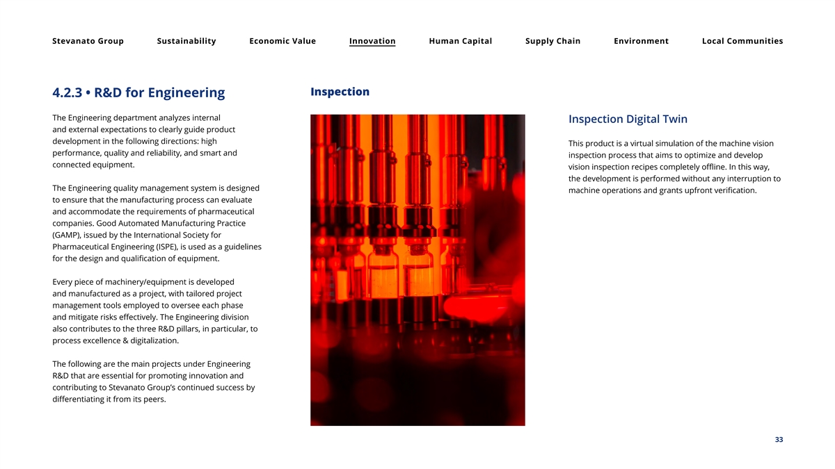 Stevanato Group Sustainability Economic Value Innovation Human Capital Supply Chain Environment Local Communities Inspection 4.2.3 • R&D for Engineering The Engineering department analyzes internal Inspection Digital Twin and external expectations to clearly guide product development in the following directions: high This product is a virtual simulation of the machine vision performance, quality and reliability, and smart and inspection process that aims to optimize and develop connected equipment. vision inspection recipes completely offline. In this way, the development is performed without any interruption to The Engineering quality management system is designed machine operations and grants upfront verification. to ensure that the manufacturing process can evaluate and accommodate the requirements of pharmaceutical companies. Good Automated Manufacturing Practice (GAMP), issued by the International Society for Pharmaceutical Engineering (ISPE), is used as a guidelines for the design and qualification of equipment. Every piece of machinery/equipment is developed and manufactured as a project, with tailored project management tools employed to oversee each phase and mitigate risks effectively. The Engineering division also contributes to the three R&D pillars, in particular, to process excellence & digitalization. The following are the main projects under Engineering R&D that are essential for promoting innovation and contributing to Stevanato Group’s continued success by differentiating it from its peers. 33