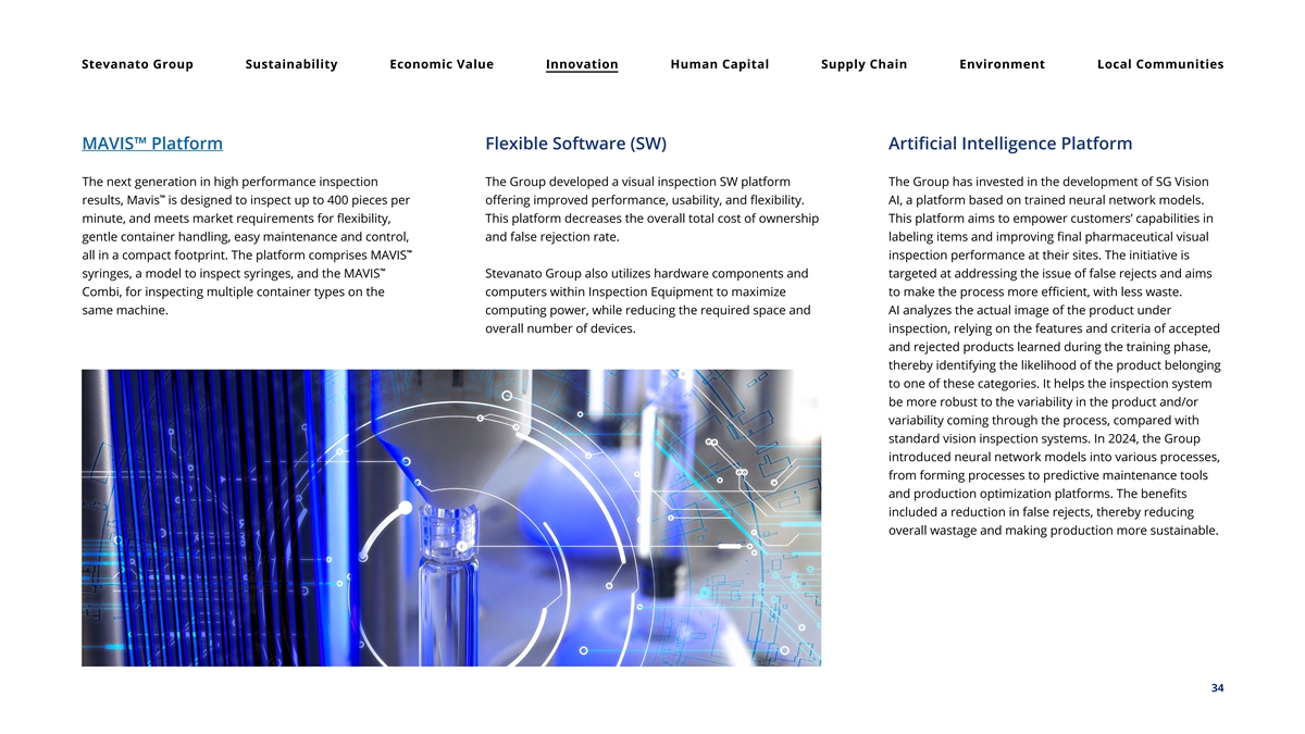 Stevanato Group Sustainability Economic Value Innovation Human Capital Supply Chain Environment Local Communities MAVIS™ Platform Flexible Software (SW) Artificial Intelligence Platform The next generation in high performance inspection The Group developed a visual inspection SW platform The Group has invested in the development of SG Vision ™ results, Mavis is designed to inspect up to 400 pieces per offering improved performance, usability, and flexibility. AI, a platform based on trained neural network models. minute, and meets market requirements for flexibility, This platform decreases the overall total cost of ownership This platform aims to empower customers’ capabilities in gentle container handling, easy maintenance and control, and false rejection rate. labeling items and improving final pharmaceutical visual ™ all in a compact footprint. The platform comprises MAVIS inspection performance at their sites. The initiative is ™ syringes, a model to inspect syringes, and the MAVIS Stevanato Group also utilizes hardware components and targeted at addressing the issue of false rejects and aims Combi, for inspecting multiple container types on the computers within Inspection Equipment to maximize to make the process more efficient, with less waste. same machine. computing power, while reducing the required space and AI analyzes the actual image of the product under overall number of devices. inspection, relying on the features and criteria of accepted and rejected products learned during the training phase, thereby identifying the likelihood of the product belonging to one of these categories. It helps the inspection system be more robust to the variability in the product and/or variability coming through the process, compared with standard vision inspection systems. In 2024, the Group introduced neural network models into various processes, from forming processes to predictive maintenance tools and production optimization platforms. The benefits included a reduction in false rejects, thereby reducing overall wastage and making production more sustainable. 34