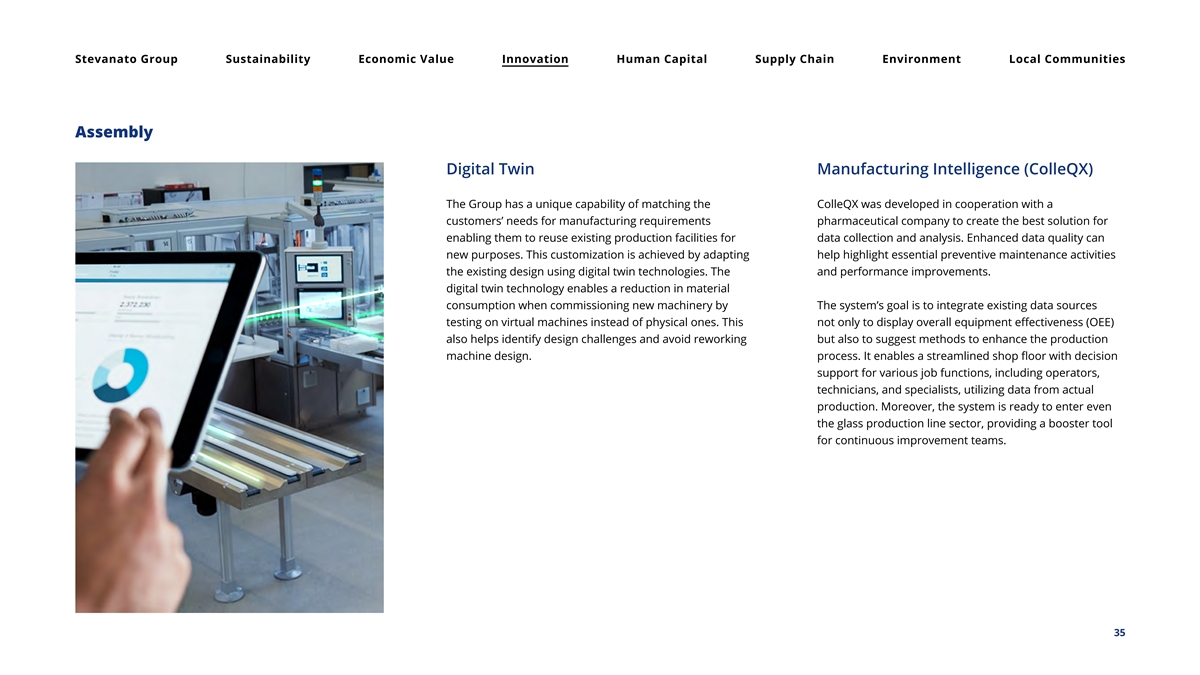 Stevanato Group Sustainability Economic Value Innovation Human Capital Supply Chain Environment Local Communities Assembly Digital Twin Manufacturing Intelligence (ColleQX) The Group has a unique capability of matching the ColleQX was developed in cooperation with a customers’ needs for manufacturing requirements pharmaceutical company to create the best solution for enabling them to reuse existing production facilities for data collection and analysis. Enhanced data quality can new purposes. This customization is achieved by adapting help highlight essential preventive maintenance activities the existing design using digital twin technologies. The and performance improvements. digital twin technology enables a reduction in material consumption when commissioning new machinery by The system’s goal is to integrate existing data sources testing on virtual machines instead of physical ones. This not only to display overall equipment effectiveness (OEE) also helps identify design challenges and avoid reworking but also to suggest methods to enhance the production machine design. process. It enables a streamlined shop floor with decision support for various job functions, including operators, technicians, and specialists, utilizing data from actual production. Moreover, the system is ready to enter even the glass production line sector, providing a booster tool for continuous improvement teams. 35