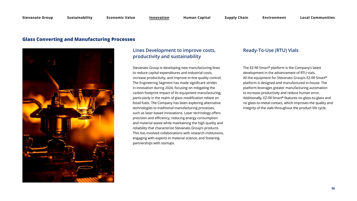 Stevanato Group Sustainability Economic Value Innovation Human Capital Supply Chain Environment Local Communities Glass Converting and Manufacturing Processes Lines Development to improve costs, Ready-To-Use (RTU) Vials productivity and sustainability ® Stevanato Group is developing new manufacturing lines The EZ-fill Smart platform is the Company’s latest to reduce capital expenditures and industrial costs, development in the advancement of RTU vials. ® increase productivity, and improve in-line quality control. All the equipment for Stevanato Group’s EZ-fill Smart The Engineering Segment has made significant strides platform is designed and manufactured in-house. The in innovation during 2024, focusing on mitigating the platform leverages greater manufacturing automation carbon footprint impact of its equipment manufacturing, to increase productivity and reduce human error. ® particularly in the realm of glass modification reliant on Additionally, EZ-fill Smart features no glass-to-glass and fossil fuels. The Company has been exploring alternative no glass-to-metal contact, which improves the quality and technologies to traditional manufacturing processes, integrity of the vials throughout the product life cycle. such as laser-based innovations. Laser technology offers precision and efficiency, reducing energy consumption and material waste while maintaining the high quality and reliability that characterize Stevanato Group’s products. This has involved collaborations with research institutions, engaging with experts in material science, and fostering partnerships with startups. 36