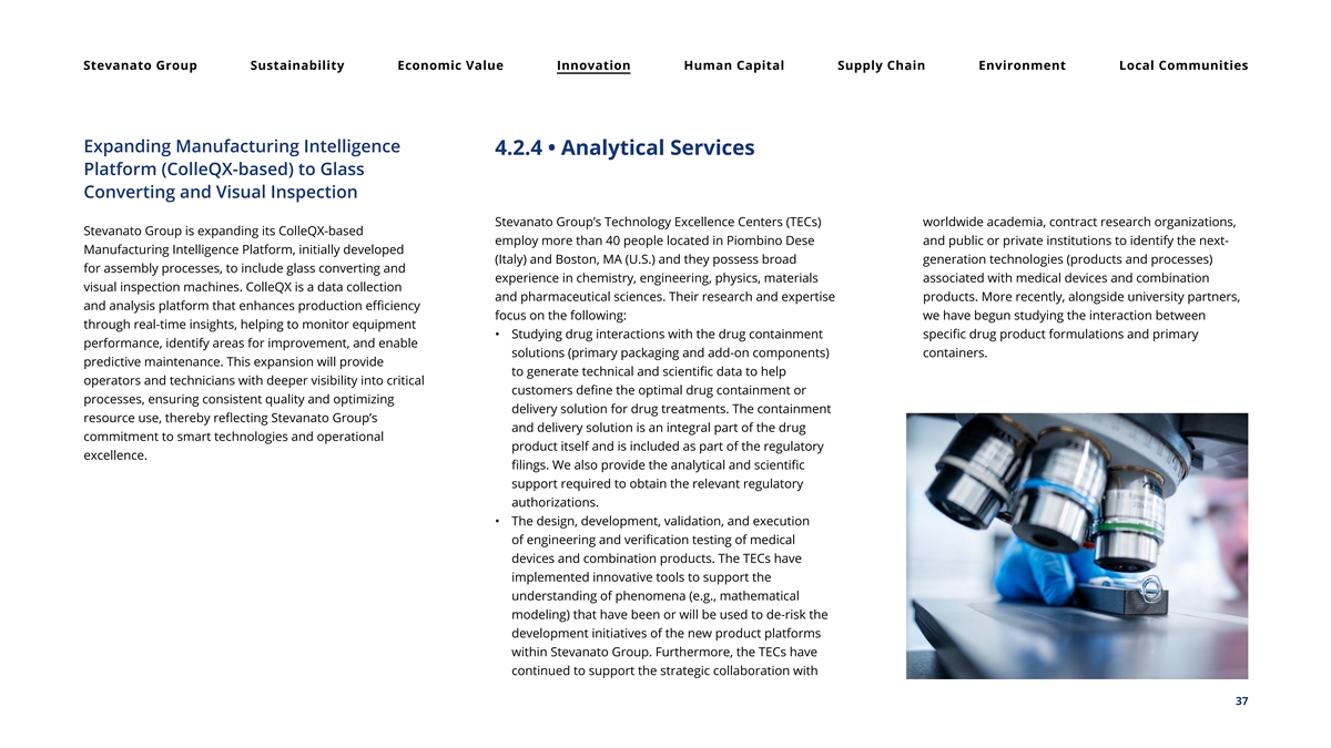 Stevanato Group Sustainability Economic Value Innovation Human Capital Supply Chain Environment Local Communities Expanding Manufacturing Intelligence 4.2.4 • Analytical Services Platform (ColleQX-based) to Glass Converting and Visual Inspection Stevanato Group’s Technology Excellence Centers (TECs) worldwide academia, contract research organizations, Stevanato Group is expanding its ColleQX-based employ more than 40 people located in Piombino Dese and public or private institutions to identify the next- Manufacturing Intelligence Platform, initially developed (Italy) and Boston, MA (U.S.) and they possess broad generation technologies (products and processes) for assembly processes, to include glass converting and experience in chemistry, engineering, physics, materials associated with medical devices and combination visual inspection machines. ColleQX is a data collection and pharmaceutical sciences. Their research and expertise products. More recently, alongside university partners, and analysis platform that enhances production efficiency focus on the following: we have begun studying the interaction between through real-time insights, helping to monitor equipment • Studying drug interactions with the drug containment specific drug product formulations and primary performance, identify areas for improvement, and enable solutions (primary packaging and add-on components) containers. predictive maintenance. This expansion will provide to generate technical and scientific data to help operators and technicians with deeper visibility into critical customers define the optimal drug containment or processes, ensuring consistent quality and optimizing delivery solution for drug treatments. The containment resource use, thereby reflecting Stevanato Group’s and delivery solution is an integral part of the drug commitment to smart technologies and operational product itself and is included as part of the regulatory excellence. filings. We also provide the analytical and scientific support required to obtain the relevant regulatory authorizations. • The design, development, validation, and execution of engineering and verification testing of medical devices and combination products. The TECs have implemented innovative tools to support the understanding of phenomena (e.g., mathematical modeling) that have been or will be used to de-risk the development initiatives of the new product platforms within Stevanato Group. Furthermore, the TECs have continued to support the strategic collaboration with 37
