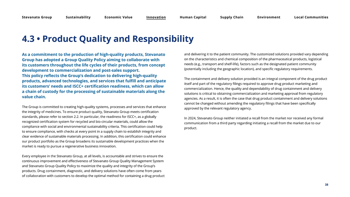 Stevanato Group Sustainability Economic Value Innovation Human Capital Supply Chain Environment Local Communities 4.3 • Product Quality and Responsibility and delivering it to the patient community. The customized solutions provided vary depending As a commitment to the production of high-quality products, Stevanato on the characteristics and chemical composition of the pharmaceutical products, logistical Group has adopted a Group Quality Policy aiming to collaborate with needs (e.g., transport and shelf-life), factors such as the designated patient community its customers throughout the life cycles of their products, from concept (potentially including the geographic location), and specific regulatory requirements. development to commercialization and post-sales support. This policy reflects the Group’s dedication to delivering high-quality The containment and delivery solution provided is an integral component of the drug product products, advanced technologies, and services that fulfill and anticipate itself and part of the regulatory filings required to approve drug product marketing and its customers’ needs and ISCC+ certification readiness, which can allow commercialization. Hence, the quality and dependability of drug containment and delivery a chain of custody for the processing of sustainable materials along the solutions is critical to obtaining commercialization and marketing approval from regulatory value chain. agencies. As a result, it is often the case that drug product containment and delivery solutions cannot be changed without amending the regulatory filings that have been specifically The Group is committed to creating high-quality systems, processes and services that enhance approved by the relevant regulatory agency. the integrity of medicines. To ensure product quality, Stevanato Group meets certification standards, please refer to section 2.2. In particular, the readiness for ISCC+, as a globally In 2024, Stevanato Group neither initiated a recall from the market nor received any formal recognized certification system for recycled and bio-circular materials, could allow the communication from a third party regarding initiating a recall from the market due to our compliance with social and environmental sustainability criteria. This certification could help product. to ensure compliance, with checks at every point in a supply chain to establish integrity and clear evidence of sustainable materials processing. In addition, this certification could enhance our product portfolio as the Group broadens its sustainable development practices when the market is ready to pursue a regenerative business innovation. Every employee in the Stevanato Group, at all levels, is accountable and strives to ensure the continuous improvement and effectiveness of Stevanato Group Quality Management System and Stevanato Group Quality Policy to maximize the quality and integrity of the Group’s products. Drug containment, diagnostic, and delivery solutions have often come from years of collaboration with customers to develop the optimal method for containing a drug product 38