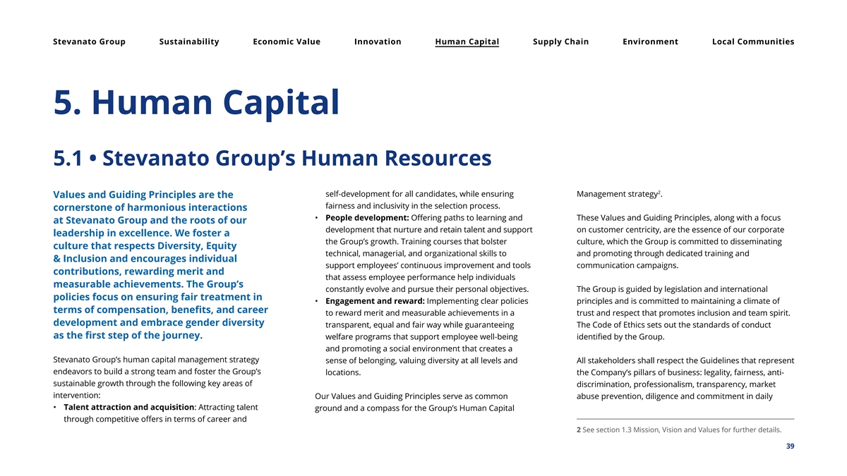 Stevanato Group Sustainability Economic Value Innovation Human Capital Supply Chain Environment Local Communities 5. Human Capital 5.1 • Stevanato Group’s Human Resources 2 self-development for all candidates, while ensuring Management strategy . Values and Guiding Principles are the fairness and inclusivity in the selection process. cornerstone of harmonious interactions • People development: Offering paths to learning and These Values and Guiding Principles, along with a focus at Stevanato Group and the roots of our development that nurture and retain talent and support on customer centricity, are the essence of our corporate leadership in excellence. We foster a the Group’s growth. Training courses that bolster culture, which the Group is committed to disseminating culture that respects Diversity, Equity technical, managerial, and organizational skills to and promoting through dedicated training and & Inclusion and encourages individual support employees’ continuous improvement and tools communication campaigns. contributions, rewarding merit and that assess employee performance help individuals measurable achievements. The Group’s constantly evolve and pursue their personal objectives. The Group is guided by legislation and international policies focus on ensuring fair treatment in • Engagement and reward: Implementing clear policies principles and is committed to maintaining a climate of terms of compensation, benefits, and career to reward merit and measurable achievements in a trust and respect that promotes inclusion and team spirit. development and embrace gender diversity transparent, equal and fair way while guaranteeing The Code of Ethics sets out the standards of conduct as the first step of the journey. welfare programs that support employee well-being identified by the Group. and promoting a social environment that creates a Stevanato Group’s human capital management strategy sense of belonging, valuing diversity at all levels and All stakeholders shall respect the Guidelines that represent endeavors to build a strong team and foster the Group’s locations. the Company’s pillars of business: legality, fairness, anti- sustainable growth through the following key areas of discrimination, professionalism, transparency, market intervention: Our Values and Guiding Principles serve as common abuse prevention, diligence and commitment in daily • Talent attraction and acquisition: Attracting talent ground and a compass for the Group’s Human Capital through competitive offers in terms of career and 2 See section 1.3 Mission, Vision and Values for further details. 39