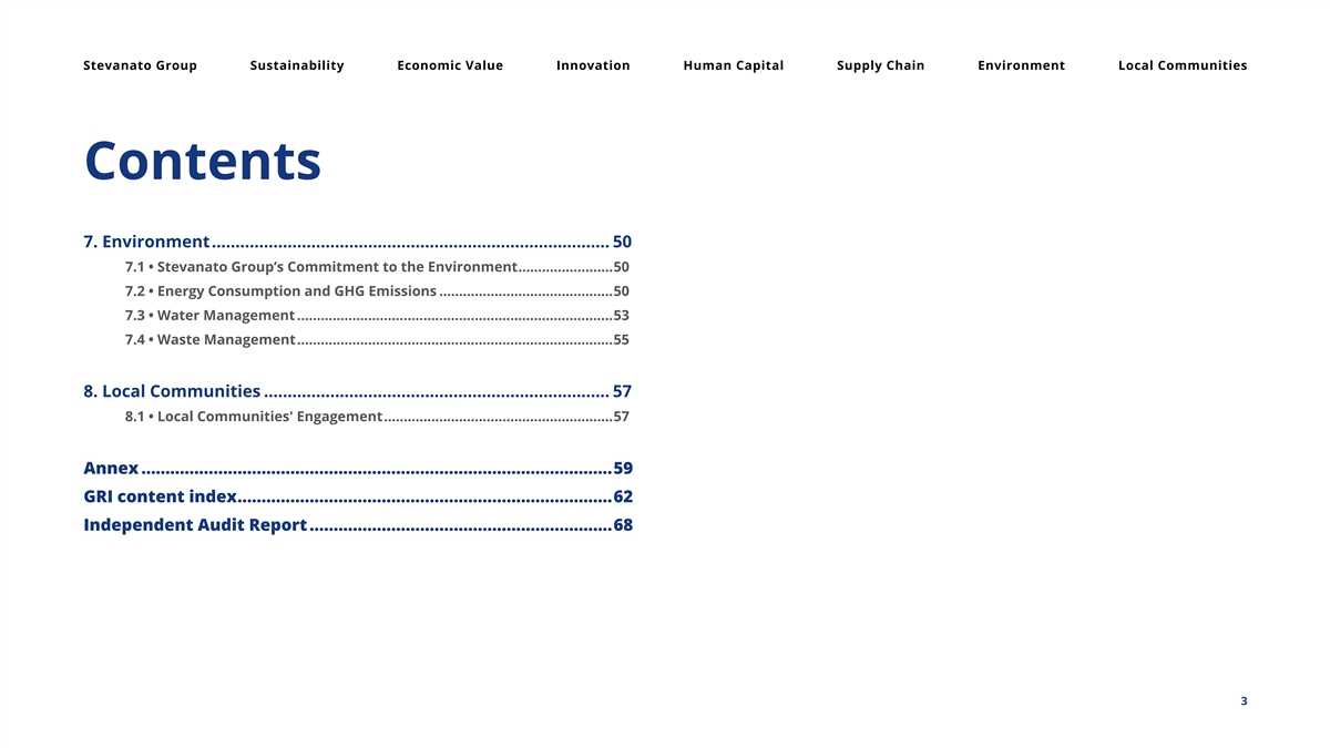 Stevanato Group Sustainability Economic Value Innovation Human Capital Supply Chain Environment Local Communities Contents 7. Environment .................................................................................... 50 7.1 • Stevanato Group’s Commitment to the Environment ........................50 7.2 • Energy Consumption and GHG Emissions ............................................50 7.3 • Water Management ................................................................................53 7.4 • Waste Management ................................................................................55 8. Local Communities ......................................................................... 57 8.1 • Local Communities' Engagement ..........................................................57 Annex ..................................................................................................59 GRI content index ..............................................................................62 Independent Audit Report ...............................................................68 3