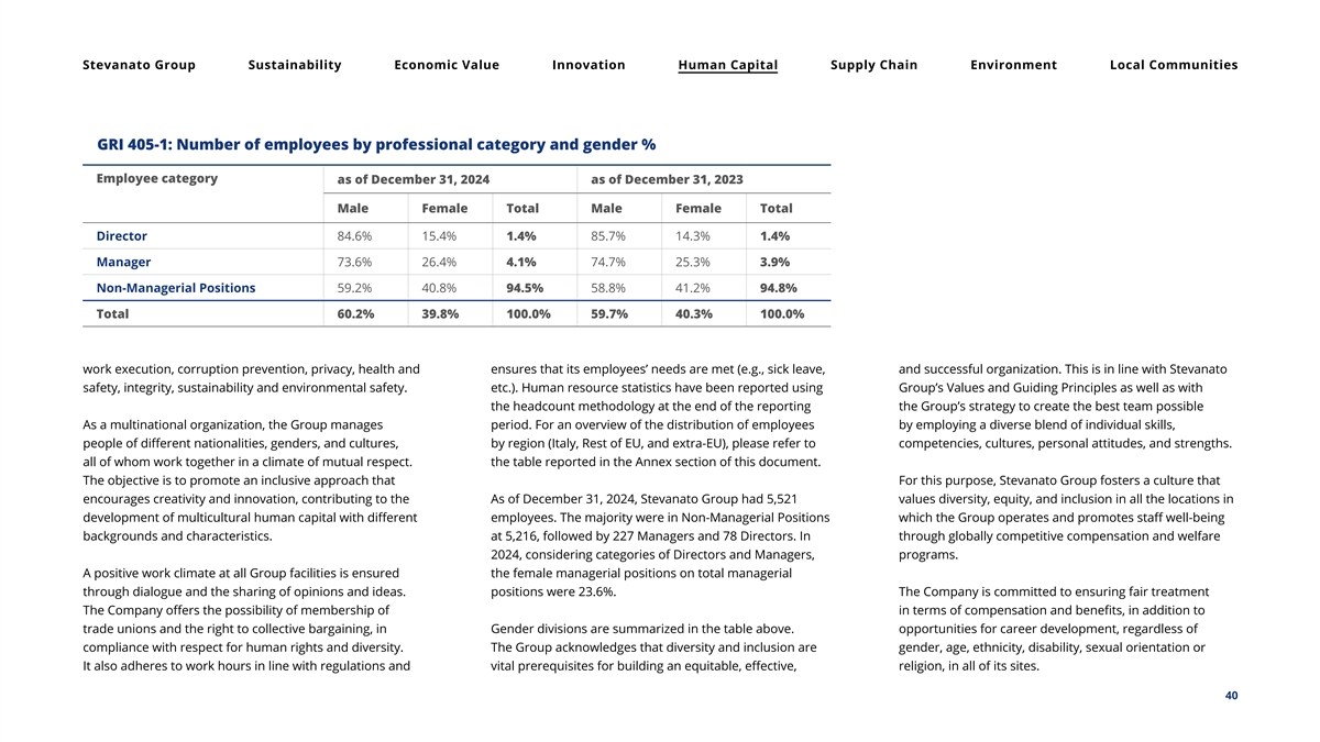 Stevanato Group Sustainability Economic Value Innovation Human Capital Supply Chain Environment Local Communities GRI 405-1: Number of employees by professional category and gender % Employee category as of December 31, 2024 as of December 31, 2023 Male Female Total Male Female Total Director 84.6% 15.4% 1.4% 85.7% 14.3% 1.4% Manager 73.6% 26.4% 4.1% 74.7% 25.3% 3.9% Non-Managerial Positions 59.2% 40.8% 94.5% 58.8% 41.2% 94.8% Total 60.2% 39.8% 100.0% 59.7% 40.3% 100.0% work execution, corruption prevention, privacy, health and ensures that its employees’ needs are met (e.g., sick leave, and successful organization. This is in line with Stevanato safety, integrity, sustainability and environmental safety. etc.). Human resource statistics have been reported using Group’s Values and Guiding Principles as well as with the headcount methodology at the end of the reporting the Group’s strategy to create the best team possible As a multinational organization, the Group manages period. For an overview of the distribution of employees by employing a diverse blend of individual skills, people of different nationalities, genders, and cultures, by region (Italy, Rest of EU, and extra-EU), please refer to competencies, cultures, personal attitudes, and strengths. all of whom work together in a climate of mutual respect. the table reported in the Annex section of this document. The objective is to promote an inclusive approach that For this purpose, Stevanato Group fosters a culture that encourages creativity and innovation, contributing to the As of December 31, 2024, Stevanato Group had 5,521 values diversity, equity, and inclusion in all the locations in development of multicultural human capital with different employees. The majority were in Non-Managerial Positions which the Group operates and promotes staff well-being backgrounds and characteristics. at 5,216, followed by 227 Managers and 78 Directors. In through globally competitive compensation and welfare 2024, considering categories of Directors and Managers, programs. A positive work climate at all Group facilities is ensured the female managerial positions on total managerial through dialogue and the sharing of opinions and ideas. positions were 23.6%. The Company is committed to ensuring fair treatment The Company offers the possibility of membership of in terms of compensation and benefits, in addition to trade unions and the right to collective bargaining, in Gender divisions are summarized in the table above. opportunities for career development, regardless of compliance with respect for human rights and diversity. The Group acknowledges that diversity and inclusion are gender, age, ethnicity, disability, sexual orientation or It also adheres to work hours in line with regulations and vital prerequisites for building an equitable, effective, religion, in all of its sites. 40