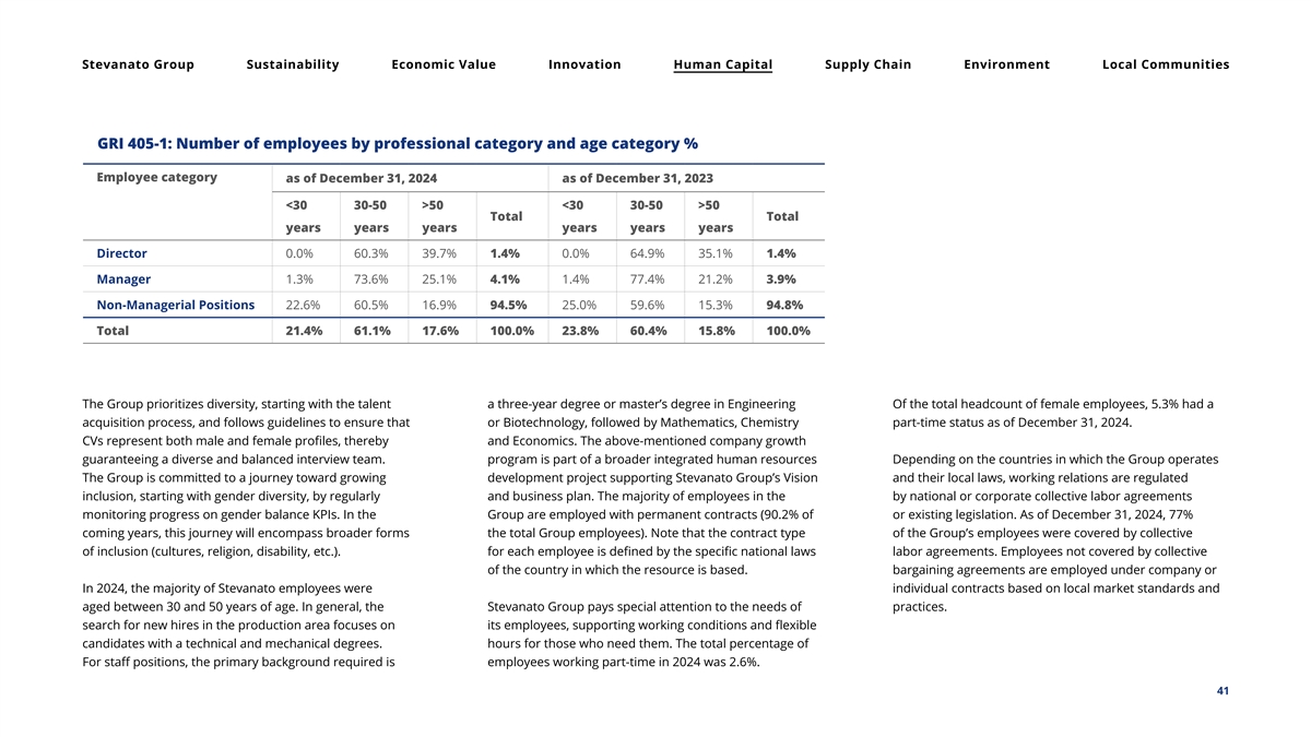 Stevanato Group Sustainability Economic Value Innovation Human Capital Supply Chain Environment Local Communities GRI 405-1: Number of employees by professional category and age category % Employee category as of December 31, 2024 as of December 31, 2023 <30 30-50 >50 <30 30-50 >50 Total Total years years years years years years Director 0.0% 60.3% 39.7% 1.4% 0.0% 64.9% 35.1% 1.4% Manager 1.3% 73.6% 25.1% 4.1% 1.4% 77.4% 21.2% 3.9% Non-Managerial Positions 22.6% 60.5% 16.9% 94.5% 25.0% 59.6% 15.3% 94.8% Total 21.4% 61.1% 17.6% 100.0% 23.8% 60.4% 15.8% 100.0% The Group prioritizes diversity, starting with the talent a three-year degree or master’s degree in Engineering Of the total headcount of female employees, 5.3% had a acquisition process, and follows guidelines to ensure that or Biotechnology, followed by Mathematics, Chemistry part-time status as of December 31, 2024. CVs represent both male and female profiles, thereby and Economics. The above-mentioned company growth guaranteeing a diverse and balanced interview team. program is part of a broader integrated human resources Depending on the countries in which the Group operates The Group is committed to a journey toward growing development project supporting Stevanato Group’s Vision and their local laws, working relations are regulated inclusion, starting with gender diversity, by regularly and business plan. The majority of employees in the by national or corporate collective labor agreements monitoring progress on gender balance KPIs. In the Group are employed with permanent contracts (90.2% of or existing legislation. As of December 31, 2024, 77% coming years, this journey will encompass broader forms the total Group employees). Note that the contract type of the Group’s employees were covered by collective of inclusion (cultures, religion, disability, etc.). for each employee is defined by the specific national laws labor agreements. Employees not covered by collective of the country in which the resource is based. bargaining agreements are employed under company or In 2024, the majority of Stevanato employees were individual contracts based on local market standards and aged between 30 and 50 years of age. In general, the Stevanato Group pays special attention to the needs of practices. search for new hires in the production area focuses on its employees, supporting working conditions and flexible candidates with a technical and mechanical degrees. hours for those who need them. The total percentage of For staff positions, the primary background required is employees working part-time in 2024 was 2.6%. 41