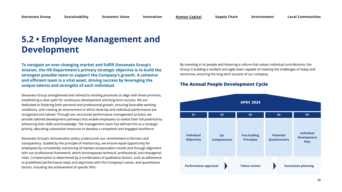 Stevanato Group Sustainability Economic Value Innovation Human Capital Supply Chain Environment Local Communities 5.2 • Employee Management and Development By investing in its people and fostering a culture that values individual contributions, the To navigate an ever-changing market and fulfill Stevanato Group’s Group is building a resilient and agile team capable of meeting the challenges of today and mission, the HR Department’s primary strategic objective is to build the tomorrow, ensuring the long-term success of our company. strongest possible team to support the Company’s growth. A cohesive and efficient team is a vital asset, driving success by leveraging the The Annual People Development Cycle unique talents and strengths of each individual. Stevanato Group strengthened and refined its existing processes to align with these priorities, establishing a clear path for continuous development and long-term success. We are dedicated to fostering both personal and professional growth, ensuring favorable working conditions, and creating an environment in which diversity and individual performance are recognized and valued. Through our structured performance management process, we provide tailored development pathways that enable employees to realize their full potential by enhancing their skills and knowledge. The management team has defined this as a strategic priority, allocating substantial resources to develop a competent and engaged workforce. Stevanato Group’s remuneration policy underscores our commitment to fairness and transparency. Guided by the principle of meritocracy, we ensure equal opportunity for employees by consistently monitoring of market compensation trends and through alignment with our professional framework, which encompasses technical, professional, and managerial roles. Compensation is determined by a combination of qualitative factors, such as adherence to predefined performance steps and alignment with the Company’s values, and quantitative factors, including the achievement of specific KPIs. 42