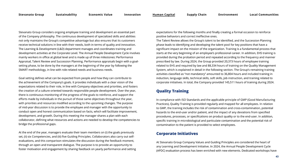 Stevanato Group Sustainability Economic Value Innovation Human Capital Supply Chain Environment Local Communities Stevanato Group considers ongoing employee training and development an essential part expectations for the following months and finally creating a formal occasion to reinforce of the Company philosophy. The continuous development of specialized skills and abilities positive behaviors and correct ineffective ones. not only maintains the Group’s competitive advantage but also ensures that its customers The Talent Review allows the Group’s talent to be identified, and the Succession Planning receive technical solutions in line with their needs, both in terms of quality and innovation. phase leads to identifying and developing the talent pool for key positions that have a The Learning & Development (L&D) department manages and coordinates training and significant impact on the mission of the organization. Training is a fundamental process that development activities at the Corporate Level. The Annual People Development Cycle involves starts at the very beginning of an employee’s professional career. In addition, EHS training is mainly workers in office at global level and is made up of three milestones: Performance provided during the probation period and repeated according to the frequency and manner Appraisal, Talent Review and Succession Planning. Performance appraisals begin with a goal- prescribed by law. During 2024, the Group provided 20,373 hours of employee training setting phase, to be done by the managers at the beginning of the year by following the related to EHS and required by law and 88,334 hours of training on the Quality Management SMART methodology, in line with role-related needs and business needs. System, which is explained in detail in the following section. The Group’s remaining training activities classified as “not mandatory” amounted to 36,804 hours and included training in Goal setting defines what can be expected from people and how they can contribute to induction, language skills, technical skills, soft skills, job instruction, and training related to the achievement of the Company’s goals. It provides individuals with a clear vision of the corporate initiatives. In total, the Company provided 145,511 hours of training during 2024. expectations related to their role, in line with Company objectives and priorities, and fosters the creation of a culture oriented towards responsible people development. Over the year, Quality Training there is continuous monitoring of the progress of the goals to reinforce, and support the efforts made by individuals in the pursuit of those same objectives throughout the year, In compliance with ISO Standards and the applicable principle of GMP (Good Manufacturing with priorities and resources modified according to the upcoming changes. The purpose Practices), Quality Training is provided regularly and mapped for all employees. In relation of mid-year discussion is to provide the employee and manager with the opportunity to to GMP, the training includes the risk of contamination and cross-contamination, potential conduct open and honest communication based on facts, which will facilitate improvement, hazards to the end-user and/or patient, and the impact of any deviations from specified development, and growth. During this meeting the manager shares a plan with each procedures, processes, or specifications on product quality or to the end-user. In addition, collaborator, defining what resources and actions are needed to develop the competencies to specific training in microbiological and particulate contamination and the potential risk of bridge the professional gaps. contamination to the patient is provided to select employees. At the end of the year, managers evaluate their team members on (i) the goals previously Corporate Initiatives set, (ii) six Competencies, and (iii) five Guiding Principles. Collaborators also carry out self- evaluations, and this comparison stimulates the discussion during the feedback moment, At Stevanato Group Company Values and Guiding Principles are considered the heart of through an open and transparent dialogue. The purpose is to provide an opportunity to any Learning and Development Initiative. In 2024, the Annual People Development Cycle foster motivation and engagement by sharing feedback on yearly performance and setting (APDC) evaluation process has been enriched with new elements. Dedicated workshops have 43