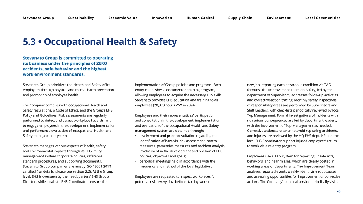 Stevanato Group Sustainability Economic Value Innovation Human Capital Supply Chain Environment Local Communities 5.3 • Occupational Health & Safety Stevanato Group is committed to operating its business under the principles of ZERO accidents, safe behavior and the highest work environment standards. Stevanato Group prioritizes the Health and Safety of its implementation of Group policies and programs. Each new job, reporting each hazardous condition via TAG employees through physical and mental harm prevention entity establishes a documented training program, formats. The Improvement Team on Safety, led by the and promotion of employee health. allowing employees to acquire the necessary EHS skills. department of Supervisors, addresses follow-up activities Stevanato provides EHS education and training to all and corrective-action tracing. Monthly safety inspections The Company complies with occupational Health and employees (20,373 hours WW in 2024). of responsibility areas are performed by Supervisors and Safety regulations, a Code of Ethics, and the Group’s EHS Shift Leaders, with checklists periodically reviewed by local Policy and Guidelines. Risk assessments are regularly Employees and their representatives’ participation Top Management. Formal investigations of incidents with performed to detect and assess workplace hazards, and and consultation in the development, implementation, no serious consequences are led by department leaders, to engage employees in the development, implementation and evaluation of the occupational Health and Safety with the involvement of Top Management as needed. and performance evaluation of occupational Health and management system are obtained through: Corrective actions are taken to avoid repeating accidents, Safety management systems. • involvement and prior consultation regarding the and injuries are reviewed by the HQ EHS dept. HR and the identification of hazards, risk assessment, control local EHS Coordinator support injured employees’ return Stevanato manages various aspects of health, safety, measures, preventive measures and accident analysis; to work via a re-entry program. and environmental impacts through its EHS Policy, • involvement in the development and revision of EHS management system corporate policies, reference policies, objectives and goals; Employees use a TAG system for reporting unsafe acts, standard procedures, and supporting documents. • periodical meetings held in accordance with the behaviors, and near misses, which are clearly posted in Stevanato Group companies are mostly ISO 45001:2018 frequency and method of the local legislation. working areas or departments. The Improvement Team certified (for details, please see section 2.2). At the Group analyzes reported events weekly, identifying root causes level, EHS is overseen by the headquarters’ EHS Group Employees are requested to inspect workplaces for and assessing opportunities for improvement or corrective Director, while local site EHS Coordinators ensure the potential risks every day, before starting work or a actions. The Company’s medical service periodically visits 45
