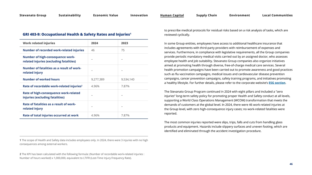 Stevanato Group Sustainability Economic Value Innovation Human Capital Supply Chain Environment Local Communities to prescribe medical protocols for residual risks based on a risk analysis of tasks, which are 1 GRI 403-9: Occupational Health & Safety Rates and Injuries reviewed cyclically. Work related injuries 2024 2023 In some Group entities, employees have access to additional healthcare insurance that includes agreements with third-party providers with reimbursement of expenses and Number of recorded work-related injuries 46 75 services. Furthermore, in compliance with legislative requirements, all the Group companies provide periodic mandatory medical visits carried out by an assigned doctor, who assesses Number of high-consequence work- – – employee health and job suitability. Stevanato Group companies also organize initiatives related injuries (excluding fatalities) aimed at promoting health through diverse, free-of-charge medical care services. Several Number of fatalities as a result of work- health promotion campaigns have been carried out to promote awareness and good practices – – related injury such as flu vaccination campaigns, medical issues and cardiovascular disease prevention campaigns, cancer prevention campaigns, safety training programs, and initiatives promoting Number of worked hours 9,277,389 9,534,140 a healthy lifestyle. For further details, please refer to the corporate website’s ESG section. 2 Rate of recordable work-related injuries 4.96% 7.87% The Stevanato Group Program continued in 2024 with eight pillars and included a “zero Rate of high-consequence work-related – – injuries” long-term safety policy for promoting proper Health and Safety conduct at all levels, injuries (excluding fatalities) supporting a World Class Operations Management (WCOM) transformation that meets the Rate of fatalities as a result of work- demands of customers at the global level. In 2024, there were 46 work-related injuries at – – related injury the Group level, with zero high-consequence injury cases; no work-related fatalities were reported. Rate of total injuries occurred at work 4.96% 7.87% The most common injuries reported were slips, trips, falls and cuts from handling glass products and equipment. Hazards include slippery surfaces and uneven footing, which are identified and eliminated through the accident investigation procedure. 1 The scope of Health and Safety data includes employees only. In 2024, there were 3 injuries with no high consequences among external workers. 2 The KPI has been calculated with the following formula: (Number of recordable work-related injuries : Number of hours worked) x 1,000,000, equivalent to LTIFR (Lost-Time Injury Frequency Rate). 46