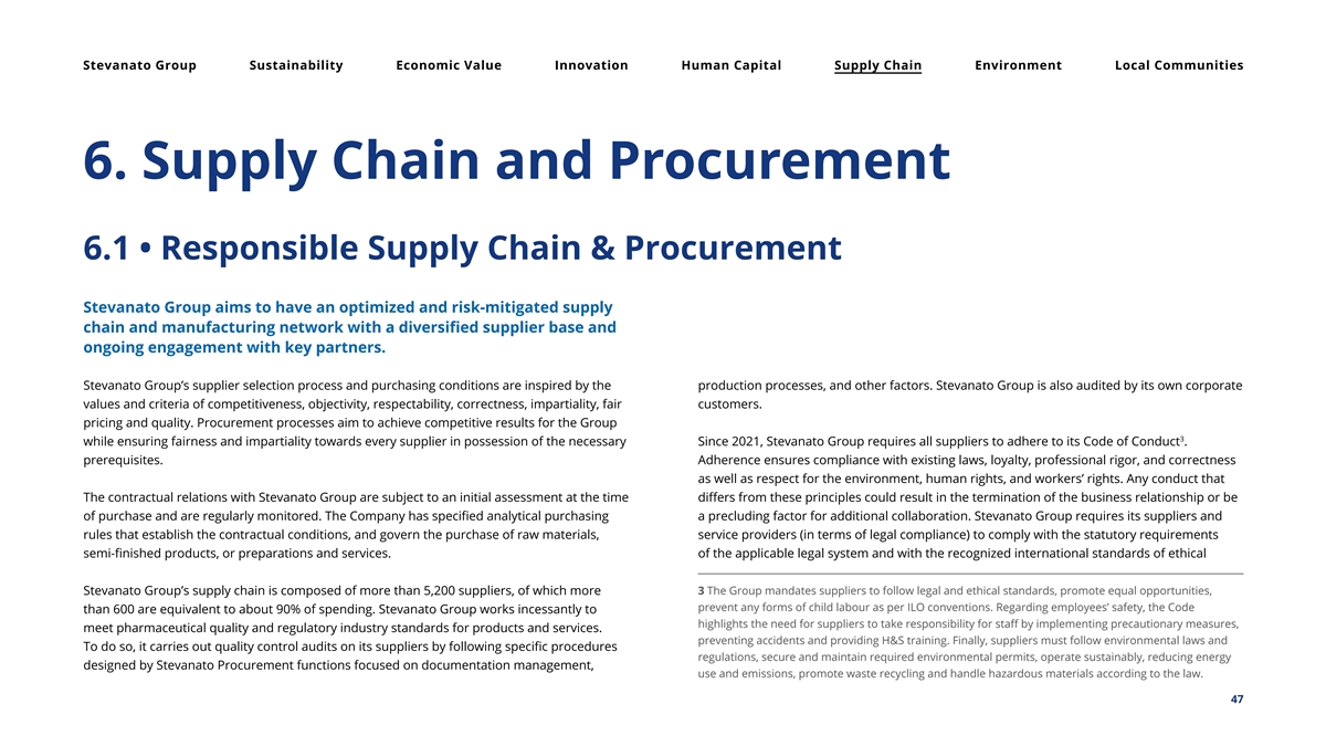 Stevanato Group Sustainability Economic Value Innovation Human Capital Supply Chain Environment Local Communities 6. Supply Chain and Pr ocurement 6.1 • Responsible Supply Chain & Procurement Stevanato Group aims to have an optimized and risk-mitigated supply chain and manufacturing network with a diversified supplier base and ongoing engagement with key partners. Stevanato Group’s supplier selection process and purchasing conditions are inspired by the production processes, and other factors. Stevanato Group is also audited by its own corporate values and criteria of competitiveness, objectivity, respectability, correctness, impartiality, fair customers. pricing and quality. Procurement processes aim to achieve competitive results for the Group 3 while ensuring fairness and impartiality towards every supplier in possession of the necessary Since 2021, Stevanato Group requires all suppliers to adhere to its Code of Conduct . prerequisites. Adherence ensures compliance with existing laws, loyalty, professional rigor, and correctness as well as respect for the environment, human rights, and workers’ rights. Any conduct that The contractual relations with Stevanato Group are subject to an initial assessment at the time differs from these principles could result in the termination of the business relationship or be of purchase and are regularly monitored. The Company has specified analytical purchasing a precluding factor for additional collaboration. Stevanato Group requires its suppliers and rules that establish the contractual conditions, and govern the purchase of raw materials, service providers (in terms of legal compliance) to comply with the statutory requirements semi-finished products, or preparations and services. of the applicable legal system and with the recognized international standards of ethical 3 The Group mandates suppliers to follow legal and ethical standards, promote equal opportunities, Stevanato Group’s supply chain is composed of more than 5,200 suppliers, of which more prevent any forms of child labour as per ILO conventions. Regarding employees’ safety, the Code than 600 are equivalent to about 90% of spending. Stevanato Group works incessantly to highlights the need for suppliers to take responsibility for staff by implementing precautionary measures, meet pharmaceutical quality and regulatory industry standards for products and services. preventing accidents and providing H&S training. Finally, suppliers must follow environmental laws and To do so, it carries out quality control audits on its suppliers by following specific procedures regulations, secure and maintain required environmental permits, operate sustainably, reducing energy designed by Stevanato Procurement functions focused on documentation management, use and emissions, promote waste recycling and handle hazardous materials according to the law. 47