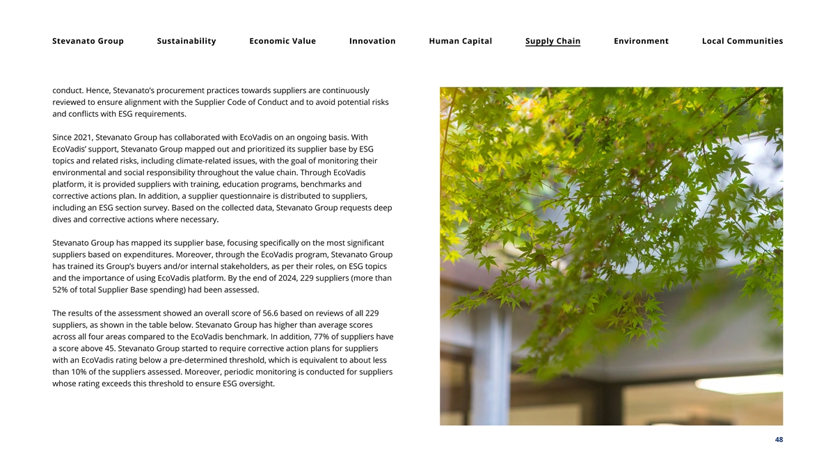 Stevanato Group Sustainability Economic Value Innovation Human Capital Supply Chain Environment Local Communities conduct. Hence, Stevanato’s procurement practices towards suppliers are continuously reviewed to ensure alignment with the Supplier Code of Conduct and to avoid potential risks and conflicts with ESG requirements. Since 2021, Stevanato Group has collaborated with EcoVadis on an ongoing basis. With EcoVadis’ support, Stevanato Group mapped out and prioritized its supplier base by ESG topics and related risks, including climate-related issues, with the goal of monitoring their environmental and social responsibility throughout the value chain. Through EcoVadis platform, it is provided suppliers with training, education programs, benchmarks and corrective actions plan. In addition, a supplier questionnaire is distributed to suppliers, including an ESG section survey. Based on the collected data, Stevanato Group requests deep dives and corrective actions where necessary. Stevanato Group has mapped its supplier base, focusing specifically on the most significant suppliers based on expenditures. Moreover, through the EcoVadis program, Stevanato Group has trained its Group’s buyers and/or internal stakeholders, as per their roles, on ESG topics and the importance of using EcoVadis platform. By the end of 2024, 229 suppliers (more than 52% of total Supplier Base spending) had been assessed. The results of the assessment showed an overall score of 56.6 based on reviews of all 229 suppliers, as shown in the table below. Stevanato Group has higher than average scores across all four areas compared to the EcoVadis benchmark. In addition, 77% of suppliers have a score above 45. Stevanato Group started to require corrective action plans for suppliers with an EcoVadis rating below a pre-determined threshold, which is equivalent to about less than 10% of the suppliers assessed. Moreover, periodic monitoring is conducted for suppliers whose rating exceeds this threshold to ensure ESG oversight. 48