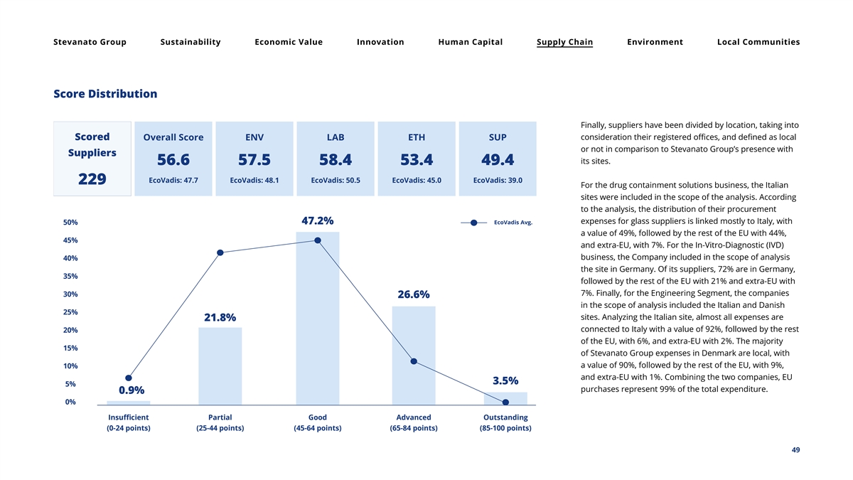 Stevanato Group Sustainability Economic Value Innovation Human Capital Supply Chain Environment Local Communities Score Distribution Finally, suppliers have been divided by location, taking into consideration their registered offices, and defined as local or not in comparison to Stevanato Group’s presence with its sites. For the drug containment solutions business, the Italian sites were included in the scope of the analysis. According to the analysis, the distribution of their procurement expenses for glass suppliers is linked mostly to Italy, with a value of 49%, followed by the rest of the EU with 44%, and extra-EU, with 7%. For the In-Vitro-Diagnostic (IVD) business, the Company included in the scope of analysis the site in Germany. Of its suppliers, 72% are in Germany, followed by the rest of the EU with 21% and extra-EU with 7%. Finally, for the Engineering Segment, the companies in the scope of analysis included the Italian and Danish sites. Analyzing the Italian site, almost all expenses are connected to Italy with a value of 92%, followed by the rest of the EU, with 6%, and extra-EU with 2%. The majority of Stevanato Group expenses in Denmark are local, with a value of 90%, followed by the rest of the EU, with 9%, and extra-EU with 1%. Combining the two companies, EU purchases represent 99% of the total expenditure. 49