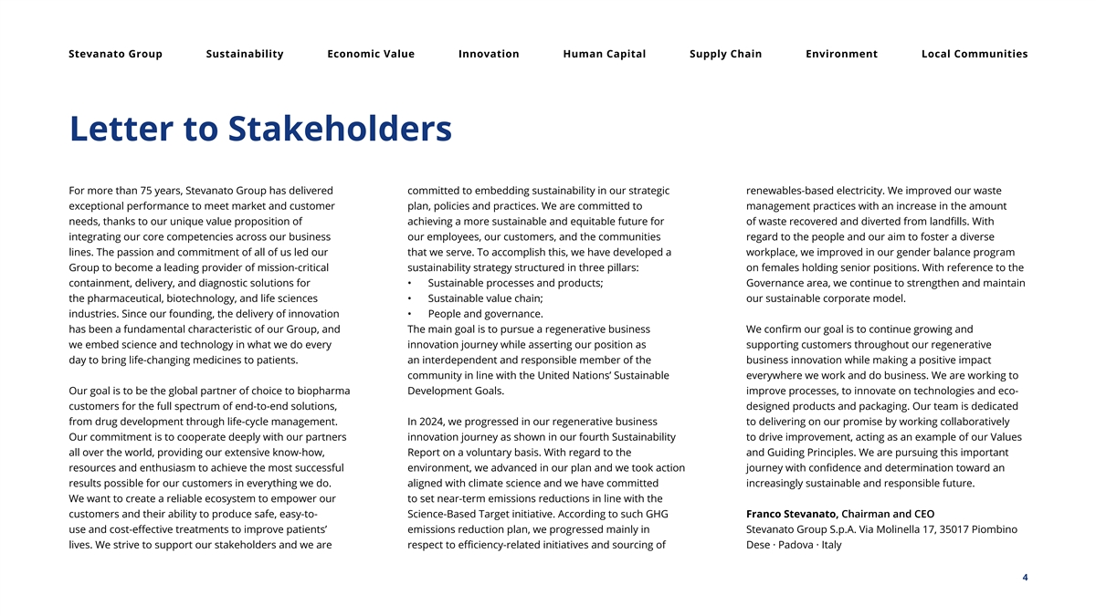 Stevanato Group Sustainability Economic Value Innovation Human Capital Supply Chain Environment Local Communities Letter to Stakeholders For more than 75 years, Stevanato Group has delivered committed to embedding sustainability in our strategic renewables-based electricity. We improved our waste exceptional performance to meet market and customer plan, policies and practices. We are committed to management practices with an increase in the amount needs, thanks to our unique value proposition of achieving a more sustainable and equitable future for of waste recovered and diverted from landfills. With integrating our core competencies across our business our employees, our customers, and the communities regard to the people and our aim to foster a diverse lines. The passion and commitment of all of us led our that we serve. To accomplish this, we have developed a workplace, we improved in our gender balance program Group to become a leading provider of mission-critical sustainability strategy structured in three pillars: on females holding senior positions. With reference to the containment, delivery, and diagnostic solutions for • Sustainable processes and products; Governance area, we continue to strengthen and maintain the pharmaceutical, biotechnology, and life sciences • Sustainable value chain; our sustainable corporate model. industries. Since our founding, the delivery of innovation • People and governance. has been a fundamental characteristic of our Group, and The main goal is to pursue a regenerative business We confirm our goal is to continue growing and we embed science and technology in what we do every innovation journey while asserting our position as supporting customers throughout our regenerative day to bring life-changing medicines to patients. an interdependent and responsible member of the business innovation while making a positive impact community in line with the United Nations’ Sustainable everywhere we work and do business. We are working to Our goal is to be the global partner of choice to biopharma Development Goals. improve processes, to innovate on technologies and eco- customers for the full spectrum of end-to-end solutions, designed products and packaging. Our team is dedicated from drug development through life-cycle management. In 2024, we progressed in our regenerative business to delivering on our promise by working collaboratively Our commitment is to cooperate deeply with our partners innovation journey as shown in our fourth Sustainability to drive improvement, acting as an example of our Values all over the world, providing our extensive know-how, Report on a voluntary basis. With regard to the and Guiding Principles. We are pursuing this important resources and enthusiasm to achieve the most successful environment, we advanced in our plan and we took action journey with confidence and determination toward an results possible for our customers in everything we do. aligned with climate science and we have committed increasingly sustainable and responsible future. We want to create a reliable ecosystem to empower our to set near-term emissions reductions in line with the customers and their ability to produce safe, easy-to- Science-Based Target initiative. According to such GHG Franco Stevanato, Chairman and CEO use and cost-effective treatments to improve patients’ emissions reduction plan, we progressed mainly in Stevanato Group S.p.A. Via Molinella 17, 35017 Piombino lives. We strive to support our stakeholders and we are respect to efficiency-related initiatives and sourcing of Dese · Padova · Italy 4