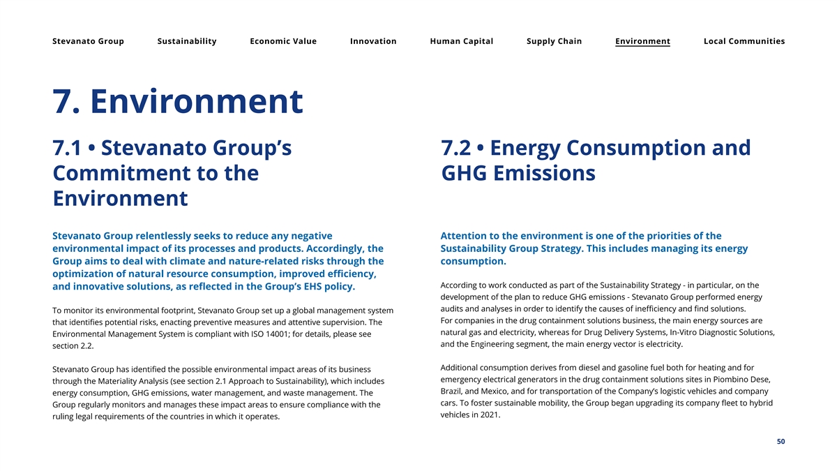 Stevanato Group Sustainability Economic Value Innovation Human Capital Supply Chain Environment Local Communities 7. Environment 7.1 • Stevanato Group’s 7.2 • Energy Consumption and Commitment to the GHG Emissions Environment Stevanato Group relentlessly seeks to reduce any negative Attention to the environment is one of the priorities of the environmental impact of its processes and products. Accordingly, the Sustainability Group Strategy. This includes managing its energy Group aims to deal with climate and nature-related risks through the consumption. optimization of natural resource consumption, improved efficiency, According to work conducted as part of the Sustainability Strategy - in particular, on the and innovative solutions, as reflected in the Group’s EHS policy. development of the plan to reduce GHG emissions - Stevanato Group performed energy audits and analyses in order to identify the causes of inefficiency and find solutions. To monitor its environmental footprint, Stevanato Group set up a global management system For companies in the drug containment solutions business, the main energy sources are that identifies potential risks, enacting preventive measures and attentive supervision. The natural gas and electricity, whereas for Drug Delivery Systems, In-Vitro Diagnostic Solutions, Environmental Management System is compliant with ISO 14001; for details, please see and the Engineering segment, the main energy vector is electricity. section 2.2. Additional consumption derives from diesel and gasoline fuel both for heating and for Stevanato Group has identified the possible environmental impact areas of its business emergency electrical generators in the drug containment solutions sites in Piombino Dese, through the Materiality Analysis (see section 2.1 Approach to Sustainability), which includes Brazil, and Mexico, and for transportation of the Company’s logistic vehicles and company energy consumption, GHG emissions, water management, and waste management. The cars. To foster sustainable mobility, the Group began upgrading its company fleet to hybrid Group regularly monitors and manages these impact areas to ensure compliance with the vehicles in 2021. ruling legal requirements of the countries in which it operates. 50