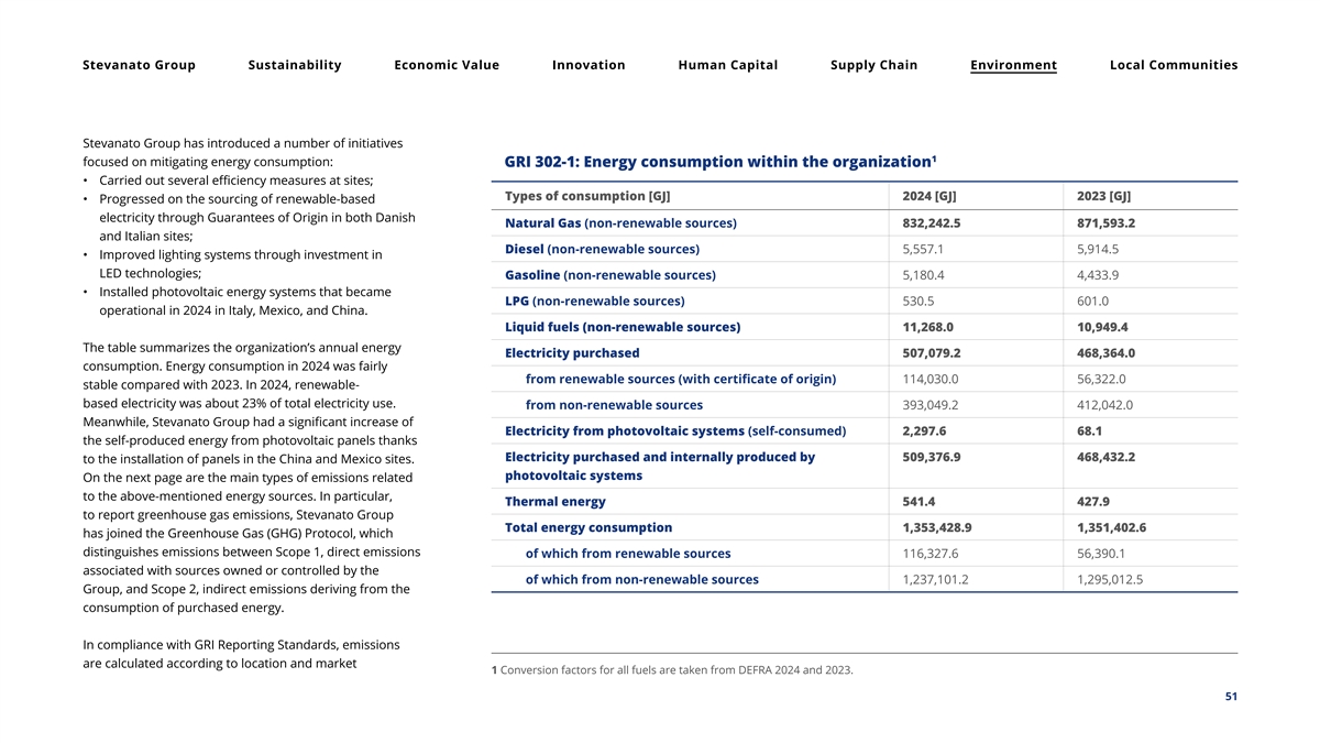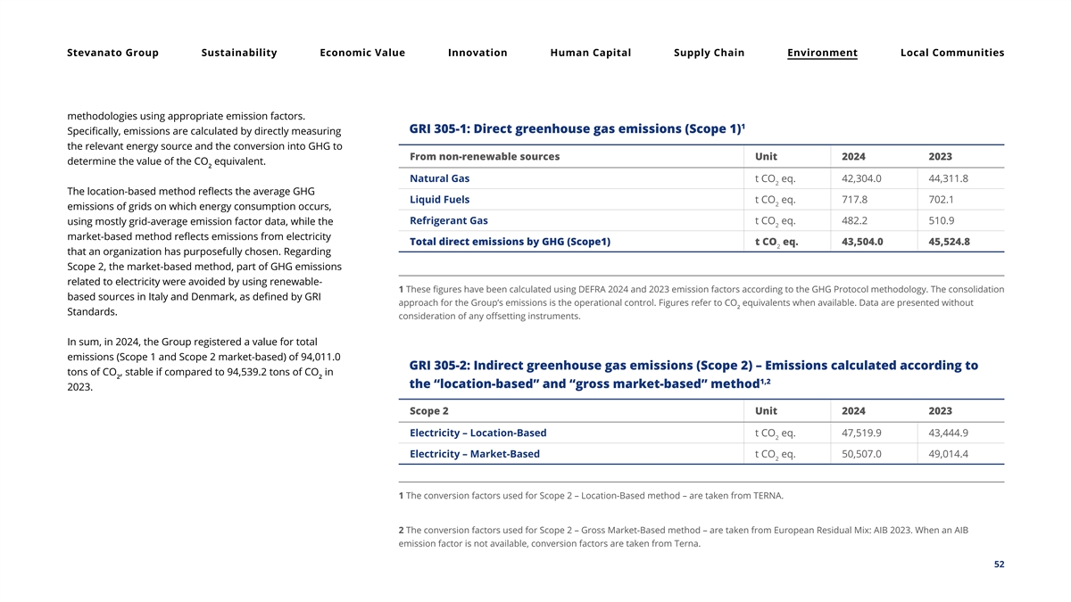 Stevanato Group Sustainability Economic Value Innovation Human Capital Supply Chain Environment Local Communities methodologies using appropriate emission factors. 1 GRI 305-1: Direct greenhouse gas emissions (Scope 1) Specifically, emissions are calculated by directly measuring the relevant energy source and the conversion into GHG to From non-renewable sources Unit 2024 2023 determine the value of the CO equivalent. 2 Natural Gas t CO eq. 42,304.0 44,311.8 2 The location-based method reflects the average GHG Liquid Fuels t CO eq. 717.8 702.1 2 emissions of grids on which energy consumption occurs, Refrigerant Gas t CO eq. 482.2 510.9 using mostly grid-average emission factor data, while the 2 market-based method reflects emissions from electricity Total direct emissions by GHG (Scope1) t CO eq. 43,504.0 45,524.8 2 that an organization has purposefully chosen. Regarding Scope 2, the market-based method, part of GHG emissions related to electricity were avoided by using renewable- 1 These figures have been calculated using DEFRA 2024 and 2023 emission factors according to the GHG Protocol methodology. The consolidation based sources in Italy and Denmark, as defined by GRI approach for the Group’s emissions is the operational control. Figures refer to CO equivalents when available. Data are presented without 2 Standards. consideration of any offsetting instruments. In sum, in 2024, the Group registered a value for total emissions (Scope 1 and Scope 2 market-based) of 94,011.0 GRI 305-2: Indirect greenhouse gas emissions (Scope 2) – Emissions calculated according to tons of CO , stable if compared to 94,539.2 tons of CO in 2 2 1,2 the “location-based” and “gross market-based” method 2023. Scope 2 Unit 2024 2023 Electricity – Location-Based t CO eq. 47,519.9 43,444.9 2 Electricity – Market-Based t CO eq. 50,507.0 49,014.4 2 1 The conversion factors used for Scope 2 – Location-Based method – are taken from TERNA. 2 The conversion factors used for Scope 2 – Gross Market-Based method – are taken from European Residual Mix: AIB 2023. When an AIB emission factor is not available, conversion factors are taken from Terna. 52