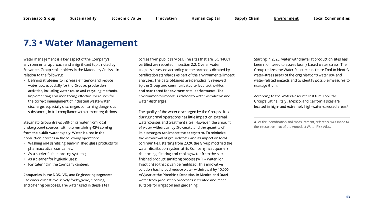 Stevanato Group Sustainability Economic Value Innovation Human Capital Supply Chain Environment Local Communities 7.3 • Water Management Water management is a key aspect of the Company’s comes from public services. The sites that are ISO 14001 Starting in 2020, water withdrawal at production sites has environmental approach and a significant topic noted by certified are reported in section 2.2. Overall water been monitored to assess locally based water stress. The Stevanato Group stakeholders in the Materiality Analysis in usage is assessed according to the protocols dictated by Group utilizes the Water Resource Institute Tool to identify relation to the following: certification standards as part of the environmental impact water-stress areas of the organization’s water use and • Defining strategies to increase efficiency and reduce analyses. The data obtained are periodically reviewed water-related impacts and to identify possible measures to water use, especially for the Group’s production by the Group and communicated to local authorities manage them. activities, including water reuse and recycling methods. and monitored for environmental performance. The • Implementing and monitoring effective measures for environmental impact is related to water withdrawn and According to the Water Resource Institute Tool, the the correct management of industrial waste-water water discharges. Group’s Latina (Italy), Mexico, and California sites are 4 discharge, especially discharges containing dangerous located in high- and extremely high-water-stressed areas . substances, in full compliance with current regulations. The quality of the water discharged by the Group’s sites during normal operations has little impact on external 4 For the identification and measurement, reference was made to Stevanato Group draws 58% of its water from local watercourses and treatment sites. However, the amount the interactive map of the Aqueduct Water Risk Atlas. underground sources, with the remaining 42% coming of water withdrawn by Stevanato and the quantity of from the public water supply. Water is used in the its discharges can impact the ecosystem. To minimize production process in the following operations: the withdrawal of groundwater and its impact on local • Washing and sanitizing semi-finished glass products for communities, starting from 2020, the Group modified the pharmaceutical companies; water distribution system at its Company headquarters, • As a carrier fluid in cooling systems; channeling, filtering and cooling water from the semi- • As a cleaner for hygienic uses; finished product sanitizing process (WFI – Water For • For catering in the Company canteen. Injection) so that it can be reutilized. This innovative solution has helped reduce water withdrawal by 10,000 3 Companies in the DDS, IVD, and Engineering segments m /year at the Piombino Dese site. In Mexico and Brazil, use water almost exclusively for hygiene, cleaning, water from production processes is treated and made and catering purposes. The water used in these sites suitable for irrigation and gardening. 53