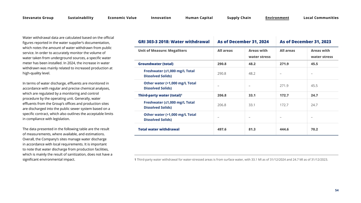 Stevanato Group Sustainability Economic Value Innovation Human Capital Supply Chain Environment Local Communities Water withdrawal data are calculated based on the official GRI 303-3 2018: Water withdrawal As of December 31, 2024 As of December 31, 2023 figures reported in the water supplier’s documentation, which notes the amount of water withdrawn from public Unit of Measure: Megaliters All areas Areas with All areas Areas with service. In order to accurately monitor the volume of water stress water stress water taken from underground sources, a specific water meter has been installed. In 2024, the increase in water Groundwater (total) 290.8 48.2 271.9 45.5 withdrawn was mainly related to increased production at Freshwater (≤1,000 mg/L Total high-quality level. 290.8 48.2 – – Dissolved Solids) Other water (>1,000 mg/L Total In terms of water discharge, effluents are monitored in – – 271.9 45.5 Dissolved Solids) accordance with regular and precise chemical analyses, which are regulated by a monitoring and control 1 Third-party water (total) 206.8 33.1 172.7 24.7 procedure by the operating unit. Generally, water Freshwater (≤1,000 mg/L Total effluents from the Group’s offices and production sites 206.8 33.1 172.7 24.7 Dissolved Solids) are discharged into the public sewer system based on a specific contract, which also outlines the acceptable limits Other water (>1,000 mg/L Total – – – – in compliance with legislation. Dissolved Solids) The data presented in the following table are the result Total water withdrawal 497.6 81.3 444.6 70.2 of measurements, where available, and estimations. Overall, the Company’s sites manage water discharge in accordance with local requirements. It is important to note that water discharge from production facilities, which is mainly the result of sanitization, does not have a significant environmental impact. 1 Third-party water withdrawal for water-stressed areas is from surface water, with 33.1 Ml as of 31/12/2024 and 24.7 Ml as of 31/12/2023. 54