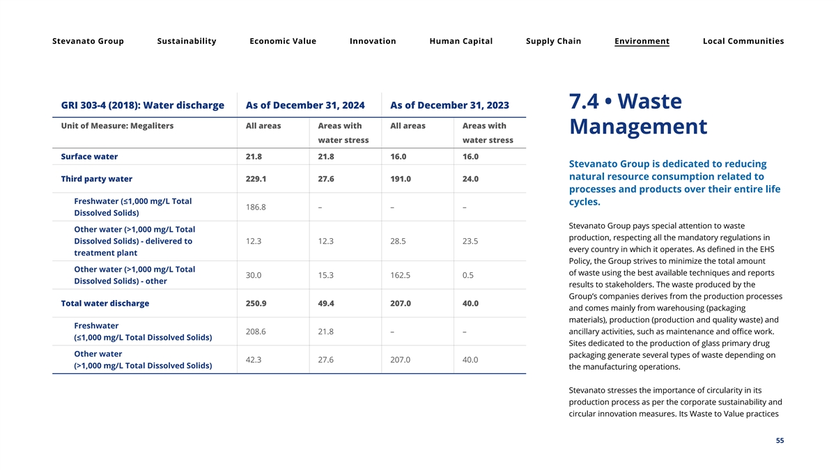 Stevanato Group Sustainability Economic Value Innovation Human Capital Supply Chain Environment Local Communities GRI 303-4 (2018): Water discharge As of December 31, 2024 As of December 31, 2023 7.4 • Waste Unit of Measure: Megaliters All areas Areas with All areas Areas with Management water stress water stress Surface water 21.8 21.8 16.0 16.0 Stevanato Group is dedicated to reducing natural resource consumption related to Third party water 229.1 27.6 191.0 24.0 processes and products over their entire life Freshwater (≤1,000 mg/L Total cycles. 186.8 – – – Dissolved Solids) Stevanato Group pays special attention to waste Other water (>1,000 mg/L Total production, respecting all the mandatory regulations in Dissolved Solids) - delivered to 12.3 12.3 28.5 23.5 every country in which it operates. As defined in the EHS treatment plant Policy, the Group strives to minimize the total amount Other water (>1,000 mg/L Total of waste using the best available techniques and reports 30.0 15.3 162.5 0.5 Dissolved Solids) - other results to stakeholders. The waste produced by the Group’s companies derives from the production processes Total water discharge 250.9 49.4 207.0 40.0 and comes mainly from warehousing (packaging materials), production (production and quality waste) and Freshwater 208.6 21.8 – – ancillary activities, such as maintenance and office work. (≤1,000 mg/L Total Dissolved Solids) Sites dedicated to the production of glass primary drug Other water packaging generate several types of waste depending on 42.3 27.6 207.0 40.0 (>1,000 mg/L Total Dissolved Solids) the manufacturing operations. Stevanato stresses the importance of circularity in its production process as per the corporate sustainability and circular innovation measures. Its Waste to Value practices 55