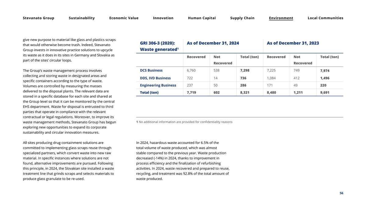 Stevanato Group Sustainability Economic Value Innovation Human Capital Supply Chain Environment Local Communities give new purpose to material like glass and plastics scraps GRI 306-3 (2020): As of December 31, 2024 As of December 31, 2023 that would otherwise become trash. Indeed, Stevanato 1 Waste generated Group invests in innovative practice solutions to upcycle its waste as it does in its sites in Germany and Slovakia as Recovered Not Total (ton) Recovered Not Total (ton) part of the sites’ circular loops. Recovered Recovered DCS Business 6,760 538 7,298 7,225 749 The Group’s waste management process involves 7,974 collecting and storing waste in designated areas and DDS, IVD Business 722 14 736 1,084 412 1,496 specific containers according to the type of waste. Engineering Business 237 50 286 171 49 220 Volumes are controlled by measuring the masses delivered to the disposal plants. The relevant data are Total (ton) 7,719 602 8,321 8,480 1,211 9,691 stored in a specific database for each site and shared at the Group level so that it can be monitored by the central EHS department. Waste for disposal is entrusted to third parties that operate in compliance with the relevant contractual or legal regulations. Moreover, to improve its 1 No additional information are provided for confidentiality reasons waste management methods, Stevanato Group has begun exploring new opportunities to expand its corporate sustainability and circular innovation measures. All sites producing drug containment solutions are In 2024, hazardous waste accounted for 6.5% of the committed to implementing glass scraps reuse through total volume of waste produced, which was almost specialized partners, which convert waste into new raw stable compared to the previous year. Waste production material. In specific instances where solutions are not decreased (-14%) in 2024, thanks to improvement in found, alternative improvements are pursued. Following process efficiency and the finalization of refurbishing this principle, in 2024, the Slovakian site installed a waste activities. In 2024, waste recovered and prepared to reuse, treatment line that grinds scraps and selects materials to recycling, and treatment was 92.8% of the total amount of produce glass granulate to be re-used. waste produced. 56