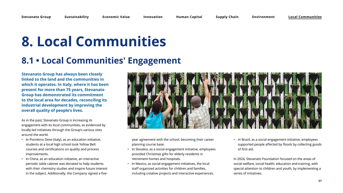 Stevanato Group Sustainability Economic Value Innovation Human Capital Supply Chain Environment Local Communities 8. Local Communities 8.1 • Local Communities' Engagement Stevanato Group has always been closely linked to the land and the communities in which it operates. In Italy, where it has been present for more than 75 years, Stevanato Group has demonstrated its commitment to the local area for decades, reconciling its industrial development by improving the overall quality of people’s lives. As in the past, Stevanato Group is increasing its engagement with its local communities, as evidenced by locally led initiatives through the Group’s various sites around the world. • In Piombino Dese (Italy), as an education initiative, year agreement with the school, becoming their career • In Brazil, as a social engagement initiative, employees students at a local high school took Yellow Belt planning course base. supported people affected by floods by collecting goods courses and certifications on quality and process • In Slovakia, as a social engagement initiative, employees of first aid. improvements. provided Christmas gifts for elderly residents in • In China, as an education initiative, an interactive retirement homes and hospitals. In 2024, Stevanato Foundation focused on the areas of periodic table cabinet was donated to help students • In Mexico, as social engagement initiatives, the local social welfare, social health, education and training, with with their chemistry studies and inspire future interest staff organized activities for children and families, special attention to children and youth, by implementing a in the subject. Additionally, the Company signed a five- including creative projects and interactive experiences. series of initiatives. 57