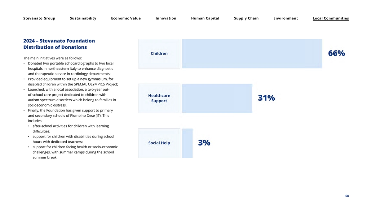 Stevanato Group Sustainability Economic Value Innovation Human Capital Supply Chain Environment Local Communities 2024 – Stevanato Foundation Distribution of Donations The main initiatives were as follows: • Donated two portable echocardiographs to two local hospitals in northeastern Italy to enhance diagnostic and therapeutic service in cardiology departments; • Provided equipment to set up a new gymnasium, for disabled children within the SPECIAL OLYMPICS Project; • Launched, with a local association, a two-year out- of-school care project dedicated to children with autism spectrum disorders which belong to families in socioeconomic distress. • Finally, the Foundation has given support to primary and secondary schools of Piombino Dese (IT). This includes: • after-school activities for children with learning difficulties; • support for children with disabilities during school hours with dedicated teachers; • support for children facing health or socio-economic challenges, with summer camps during the school summer break. 58