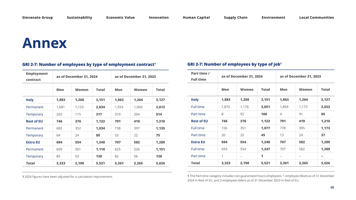 Stevanato Group Sustainability Economic Value Innovation Human Capital Supply Chain Environment Local Communities Annex 1 1 GRI 2-7: Number of employees by type of job GRI 2-7: Number of employees by type of employment contract Part time / Employment as of December 31, 2024 as of December 31, 2023 as of December 31, 2024 as of December 31, 2023 Full time contract Men Women Total Men Women Total Men Women Total Men Women Total Italy 1,883 1,268 3,151 1,863 1,264 3,127 Italy 1,883 1,268 3,151 1,863 1,264 3,127 Full time 1,875 1,176 3,051 1,859 1,173 3,032 Permanent 1,681 1,153 2,834 1,553 1,060 2,613 Part time 8 92 100 4 91 95 Temporary 202 115 317 310 204 514 Rest of EU 746 376 1,122 791 419 1,210 Rest of EU 746 376 1,122 791 419 1,210 Full time 726 351 1,077 778 395 1,173 Permanent 682 352 1,034 738 397 1,135 Part time 20 25 45 13 24 37 Temporary 64 24 88 53 22 75 Extra EU 694 554 1,248 707 582 1,289 Extra EU 694 554 1,248 707 582 1,289 Full time 693 554 1,247 707 582 1,289 Permanent 609 501 1,110 625 526 1,151 Part time 1 – 1 – – – Temporary 85 53 138 82 56 138 Total 3,323 2,198 5,521 3,361 2,265 5,626 Total 3,323 2,198 5,521 3,361 2,265 5,626 1 The Part-time category includes non-guaranteed hours employees: 1 employee (Man) as of 31 December 1 2024 figures have been adjusted for a calculation improvement. 2024 in Rest of EU, and 2 employees (Men) as of 31 December 2023 in Rest of EU. 59