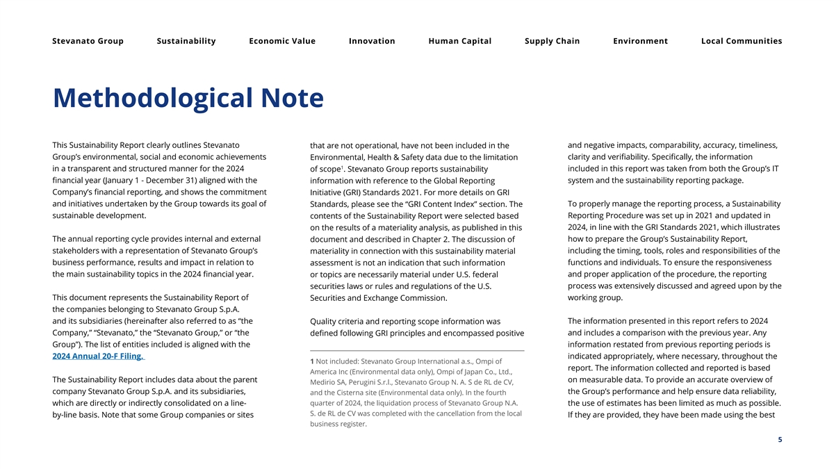 Stevanato Group Sustainability Economic Value Innovation Human Capital Supply Chain Environment Local Communities Methodological Note This Sustainability Report clearly outlines Stevanato and negative impacts, comparability, accuracy, timeliness, that are not operational, have not been included in the Group’s environmental, social and economic achievements clarity and verifiability. Specifically, the information Environmental, Health & Safety data due to the limitation 1 in a transparent and structured manner for the 2024 included in this report was taken from both the Group’s IT of scope . Stevanato Group reports sustainability financial year (January 1 - December 31) aligned with the system and the sustainability reporting package. information with reference to the Global Reporting Company’s financial reporting, and shows the commitment Initiative (GRI) Standards 2021. For more details on GRI and initiatives undertaken by the Group towards its goal of To properly manage the reporting process, a Sustainability Standards, please see the “GRI Content Index” section. The sustainable development. Reporting Procedure was set up in 2021 and updated in contents of the Sustainability Report were selected based 2024, in line with the GRI Standards 2021, which illustrates on the results of a materiality analysis, as published in this The annual reporting cycle provides internal and external how to prepare the Group’s Sustainability Report, document and described in Chapter 2. The discussion of stakeholders with a representation of Stevanato Group’s including the timing, tools, roles and responsibilities of the materiality in connection with this sustainability material business performance, results and impact in relation to functions and individuals. To ensure the responsiveness assessment is not an indication that such information the main sustainability topics in the 2024 financial year. and proper application of the procedure, the reporting or topics are necessarily material under U.S. federal process was extensively discussed and agreed upon by the securities laws or rules and regulations of the U.S. This document represents the Sustainability Report of working group. Securities and Exchange Commission. the companies belonging to Stevanato Group S.p.A. and its subsidiaries (hereinafter also referred to as “the The information presented in this report refers to 2024 Quality criteria and reporting scope information was Company,” “Stevanato,” the “Stevanato Group,” or “the and includes a comparison with the previous year. Any defined following GRI principles and encompassed positive Group”). The list of entities included is aligned with the information restated from previous reporting periods is 2024 Annual 20-F Filing. indicated appropriately, where necessary, throughout the 1 Not included: Stevanato Group International a.s., Ompi of report. The information collected and reported is based America Inc (Environmental data only), Ompi of Japan Co., Ltd., The Sustainability Report includes data about the parent on measurable data. To provide an accurate overview of Medirio SA, Perugini S.r.l., Stevanato Group N. A. S de RL de CV, company Stevanato Group S.p.A. and its subsidiaries, the Group’s performance and help ensure data reliability, and the Cisterna site (Environmental data only). In the fourth quarter of 2024, the liquidation process of Stevanato Group N.A. which are directly or indirectly consolidated on a line- the use of estimates has been limited as much as possible. S. de RL de CV was completed with the cancellation from the local by-line basis. Note that some Group companies or sites If they are provided, they have been made using the best business register. 5