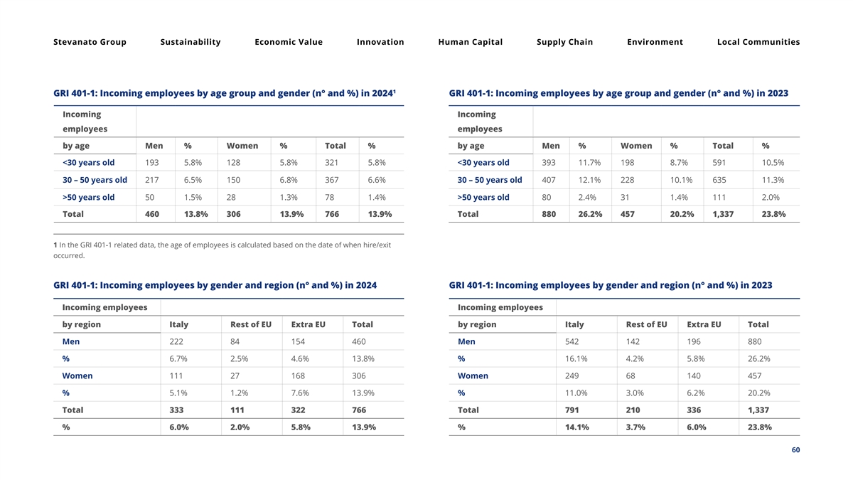 Stevanato Group Sustainability Economic Value Innovation Human Capital Supply Chain Environment Local Communities 1 GRI 401-1: Incoming employees by age group and gender (n° and %) in 2024 GRI 401-1: Incoming employees by age group and gender (n° and %) in 2023 Incoming Incoming employees employees by age Men % Women % Total % by age Men % Women % Total % <30 years old 193 5.8% 128 5.8% 321 5.8% <30 years old 393 11.7% 198 8.7% 591 10.5% 30 – 50 years old 217 6.5% 150 6.8% 367 6.6% 30 – 50 years old 407 12.1% 228 10.1% 635 11.3% >50 years old 50 1.5% 28 1.3% 78 1.4% >50 years old 80 2.4% 31 1.4% 111 2.0% Total 460 13.8% 306 13.9% 766 13.9% Total 880 26.2% 457 20.2% 1,337 23.8% 1 In the GRI 401-1 related data, the age of employees is calculated based on the date of when hire/exit occurred. GRI 401-1: Incoming employees by gender and region (n° and %) in 2024 GRI 401-1: Incoming employees by gender and region (n° and %) in 2023 Incoming employees Incoming employees by region Italy Rest of EU Extra EU Total by region Italy Rest of EU Extra EU Total Men 222 84 154 460 Men 542 142 196 880 % 6.7% 2.5% 4.6% 13.8% % 16.1% 4.2% 5.8% 26.2% Women 111 27 168 306 Women 249 68 140 457 % 5.1% 1.2% 7.6% 13.9% % 11.0% 3.0% 6.2% 20.2% Total 333 111 322 766 Total 791 210 336 1,337 % 6.0% 2.0% 5.8% 13.9% % 14.1% 3.7% 6.0% 23.8% 60
