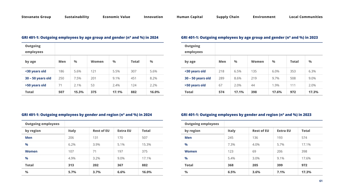 Stevanato Group Sustainability Economic Value Innovation Human Capital Supply Chain Environment Local Communities GRI 401-1: Outgoing employees by age group and gender (n° and %) in 2024 GRI 401-1: Outgoing employees by age group and gender (n° and %) in 2023 Outgoing Outgoing employees employees by age Men % Women % Total % by age Men % Women % Total % <30 years old 186 5.6% 121 5.5% 307 5.6% <30 years old 218 6.5% 135 6.0% 353 6.3% 30 – 50 years old 250 7.5% 201 9.1% 451 8.2% 30 – 50 years old 289 8.6% 219 9.7% 508 9.0% >50 years old 71 2.1% 53 2.4% 124 2.2% >50 years old 67 2.0% 44 1.9% 111 2.0% Total 507 15.3% 375 17.1% 882 16.0% Total 574 17.1% 398 17.6% 972 17.3% GRI 401-1: Outgoing employees by gender and region (n° and %) in 2024 GRI 401-1: Outgoing employees by gender and region (n° and %) in 2023 Outgoing employees Outgoing employees by region Italy Rest of EU Extra EU Total by region Italy Rest of EU Extra EU Total Men 206 131 170 507 Men 245 136 193 574 % 6.2% 3.9% 5.1% 15.3% % 7.3% 4.0% 5.7% 17.1% Women 107 71 197 375 Women 123 69 206 398 % 4.9% 3.2% 9.0% 17.1% % 5.4% 3.0% 9.1% 17.6% Total 313 202 367 882 Total 368 205 399 972 % 5.7% 3.7% 6.6% 16.0% % 6.5% 3.6% 7.1% 17.3% 61