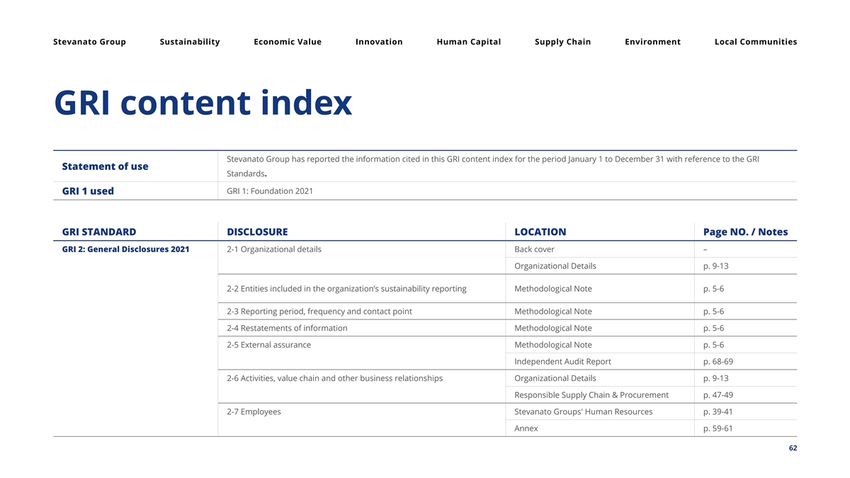 Stevanato Group Sustainability Economic Value Innovation Human Capital Supply Chain Environment Local Communities GRI content inde x Stevanato Group has reported the information cited in this GRI content index for the period January 1 to December 31 with reference to the GRI Statement of use Standards. GRI 1: Foundation 2021 GRI 1 used GRI STANDARD DISCLOSURE LOCATION Page NO. / Notes GRI 2: General Disclosures 2021 2-1 Organizational details Back cover – Organizational Details p. 9-13 2-2 Entities included in the organization’s sustainability reporting Methodological Note p. 5-6 2-3 Reporting period, frequency and contact point Methodological Note p. 5-6 2-4 Restatements of information Methodological Note p. 5-6 2-5 External assurance Methodological Note p. 5-6 Independent Audit Report p. 68-69 2-6 Activities, value chain and other business relationships Organizational Details p. 9-13 Responsible Supply Chain & Procurement p. 47-49 2-7 Employees Stevanato Groups' Human Resources p. 39-41 Annex p. 59-61 62