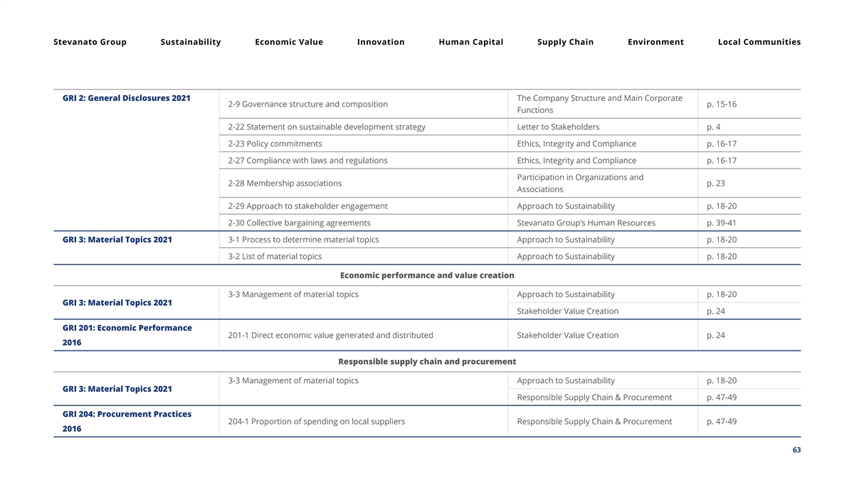 Stevanato Group Sustainability Economic Value Innovation Human Capital Supply Chain Environment Local Communities GRI 2: General Disclosures 2021 The Company Structure and Main Corporate 2-9 Governance structure and composition p. 15-16 Functions 2-22 Statement on sustainable development strategy Letter to Stakeholders p. 4 2-23 Policy commitments Ethics, Integrity and Compliance p. 16-17 2-27 Compliance with laws and regulations Ethics, Integrity and Compliance p. 16-17 Participation in Organizations and 2-28 Membership associations p. 23 Associations 2-29 Approach to stakeholder engagement Approach to Sustainability p. 18-20 2-30 Collective bargaining agreements Stevanato Group’s Human Resources p. 39-41 GRI 3: Material Topics 2021 3-1 Process to determine material topics Approach to Sustainability p. 18-20 3-2 List of material topics Approach to Sustainability p. 18-20 Economic performance and value creation 3-3 Management of material topics Approach to Sustainability p. 18-20 GRI 3: Material Topics 2021 Stakeholder Value Creation p. 24 GRI 201: Economic Performance 201-1 Direct economic value generated and distributed Stakeholder Value Creation p. 24 2016 Responsible supply chain and procurement 3-3 Management of material topics Approach to Sustainability p. 18-20 GRI 3: Material Topics 2021 Responsible Supply Chain & Procurement p. 47-49 GRI 204: Procurement Practices 204-1 Proportion of spending on local suppliers Responsible Supply Chain & Procurement p. 47-49 2016 63